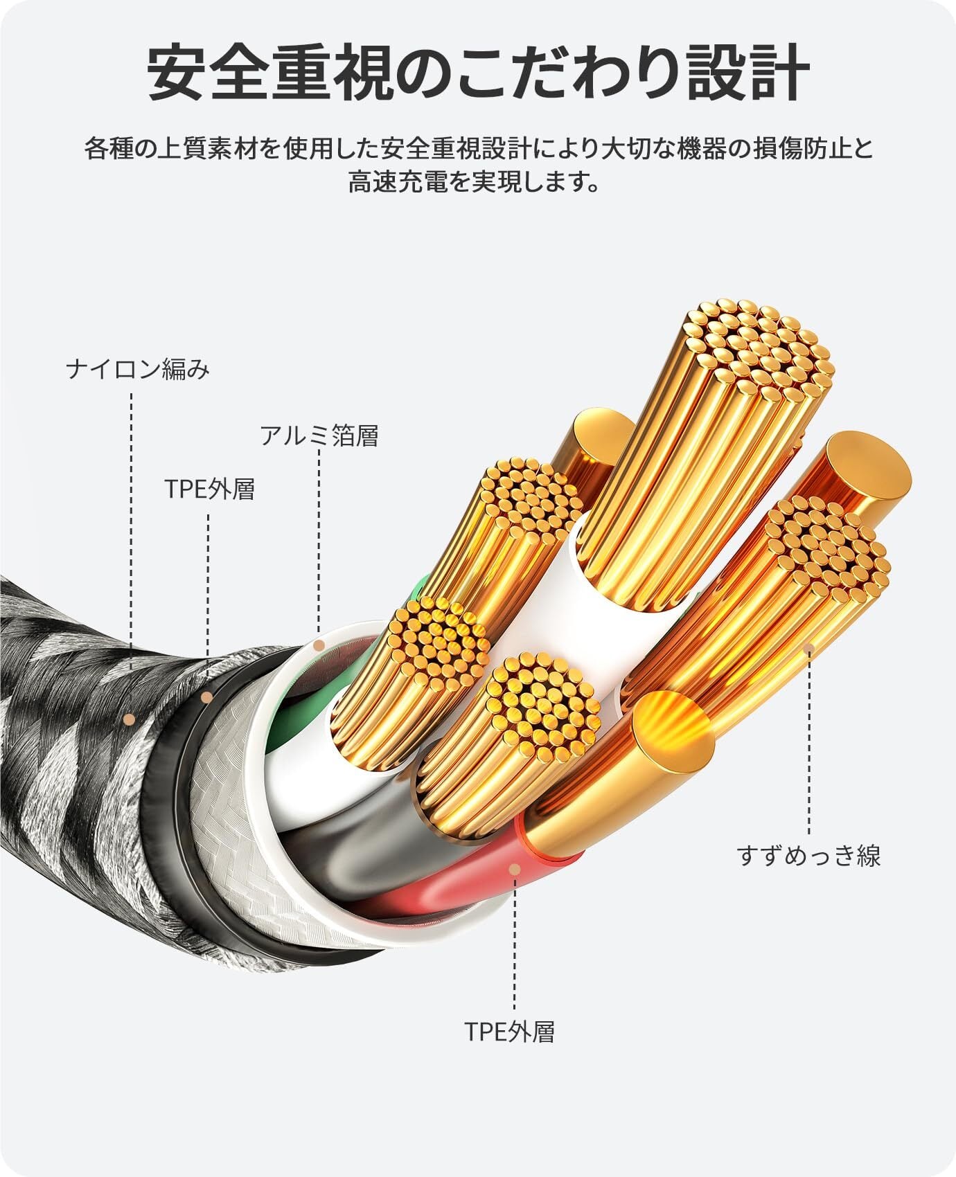 【安全重視のこだわり設計】このtypec ケーブルは各種の上質素材を使用した安全重視設計により3Aの高出力を流せしかも過充電と発熱などを防ぎ、安定性の高い急速充電と大切な機器の損傷防止を実現します。