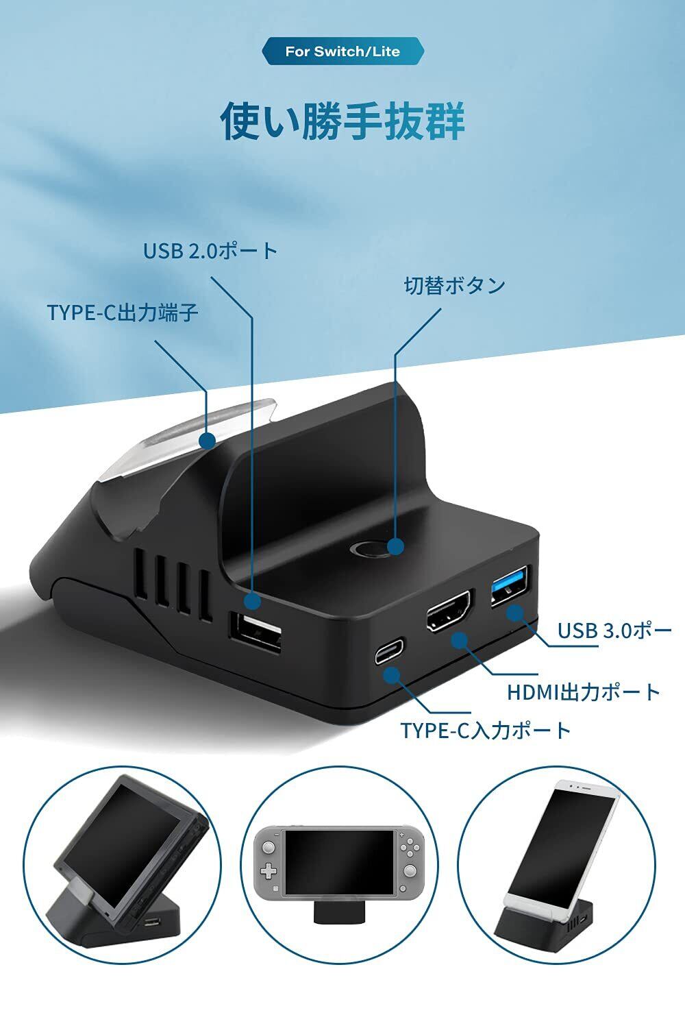 Switch2/Switch OLED/Switchドック 充電スタンド TV出力 ミニドック hdmi変換アダプター(4段階角度調整/最新システム対応/TVモード/テーブルモード) 切り替え 放熱対策 小型 三つのUSBポート&Type-Cポート (Switch ドック)