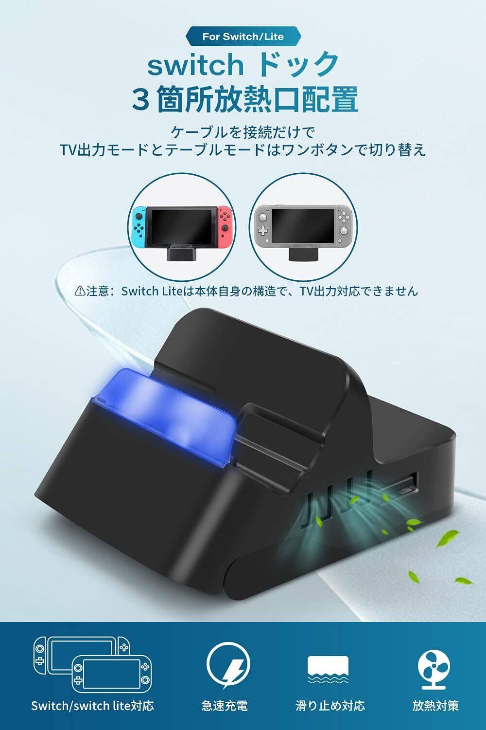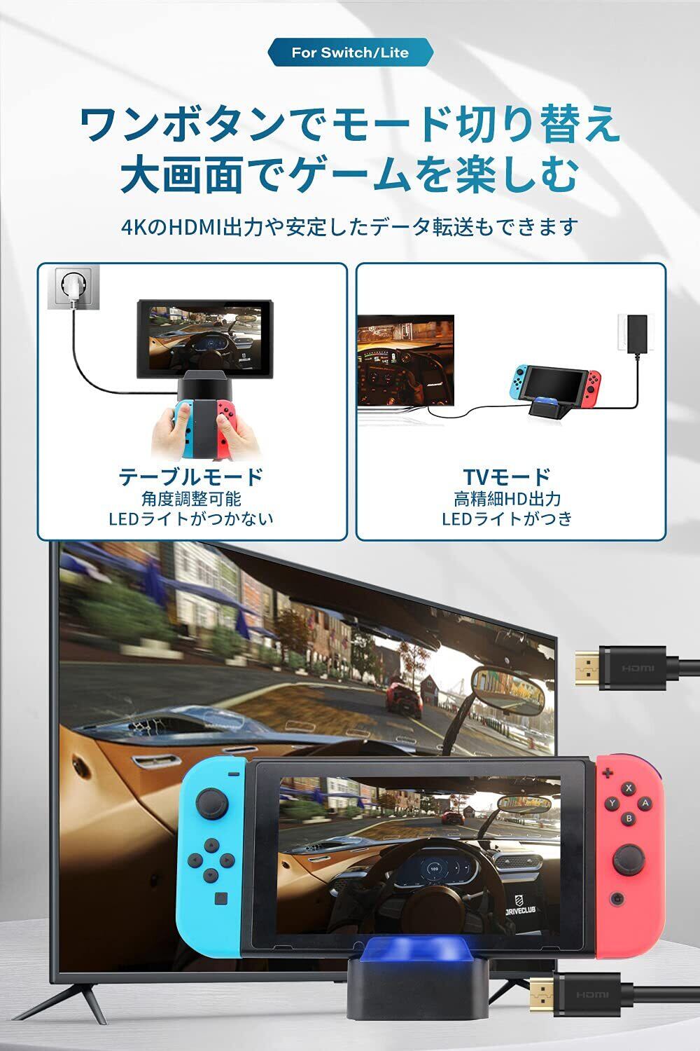 【ワンボタンでモード切替】ミニドックの上にあるボタンで、テーブルモードとTVモードに切り替える機能が実現しました。テーブルモードの場合、Switch OLED/switchを充電しながらゲームができます。テレビモートの場合、大画面でみんなでゲームを体験できます。最新のシステムと互換性があり、操作が簡単で使いやすいです。注意:①Switch純正のアダプターで給電してください。②Switch Liteは本体自身の構造で、TV出力対応できません。③テレビモードでのみ、ライトが点灯します。④一部分のテレビには、連動が対応できなくて、手動でリモコンのhdmi入力に切替してください。
