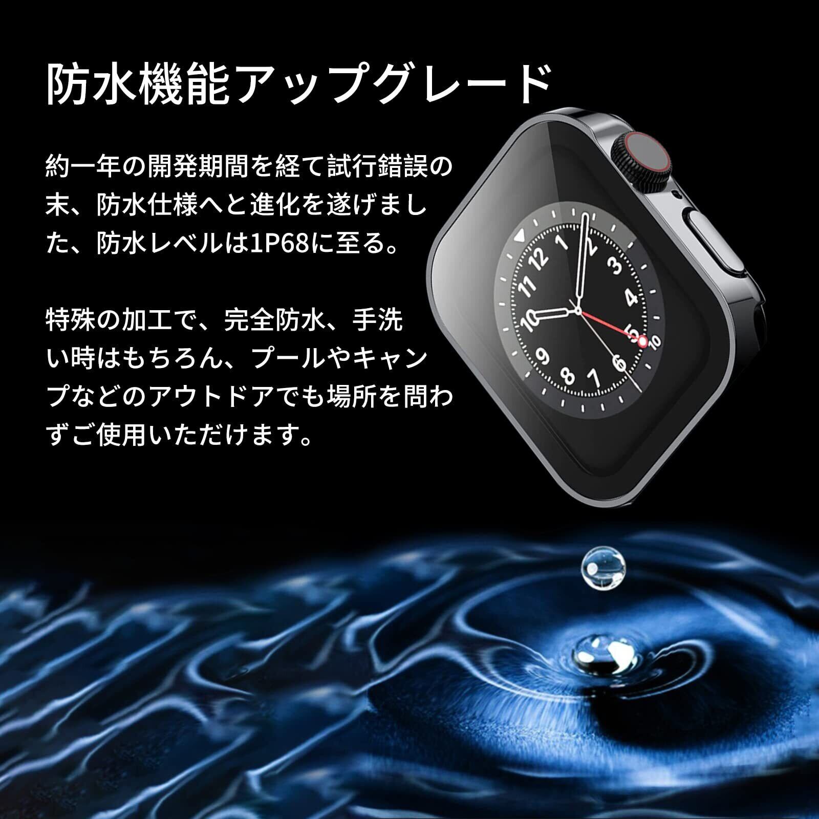 【防水・防塵設計】 シーリングリング内蔵で完全防水のアップルウォッチ ケース。水の浸入やほこりを防ぎ、ウォッチを常に清潔に保ちます。強化ガラス表面は水が溜まらず、日常生活での使用に最適です。簡単な手入れで長くお使いいただけます。防水粘着リング付きで取り付けが簡単です。