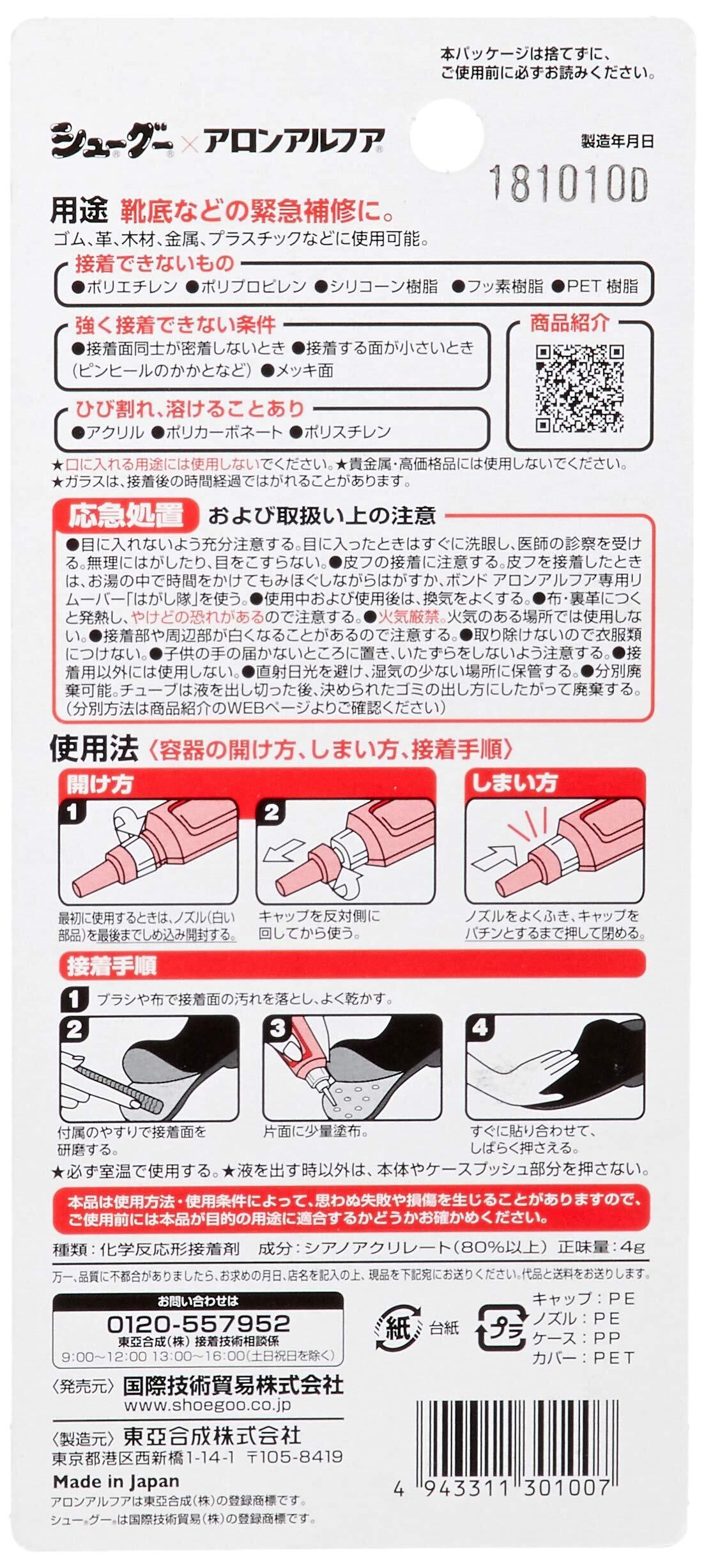 「シューグーアロンアルフア(ゼリー状)」は、瞬間接着材で有名な「アロンアルフア」の東亞合成株式会社の協力により開発された、靴底剥がれなどの貼り合わせに特化した瞬間接着剤です。