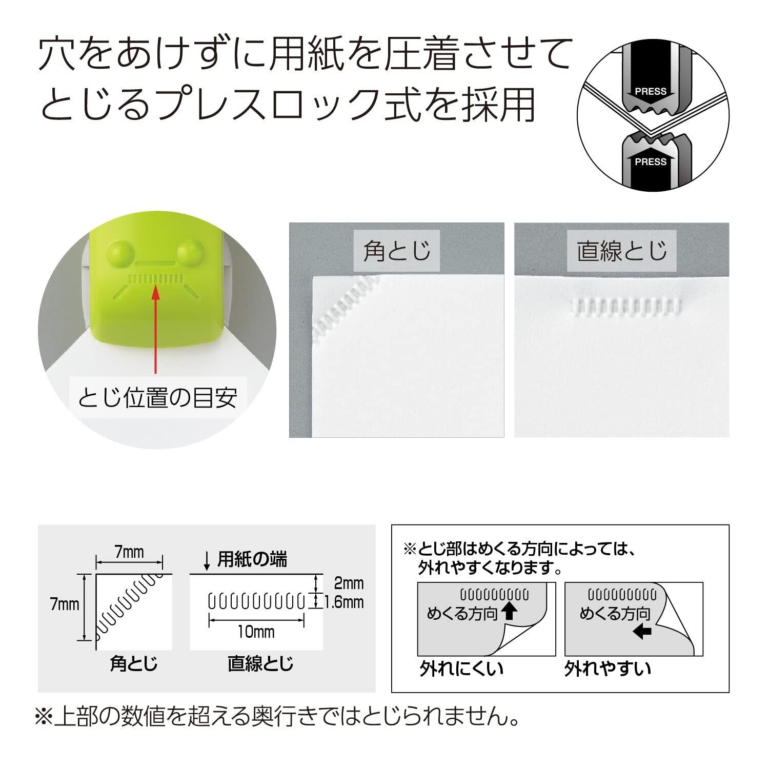 針なしで紙をとじる! 穴をあけずに用紙を圧着させてとじるプレスロック式を採用。美しく省スペースに紙がとじられます。とじた紙を外すことも簡単にできます。