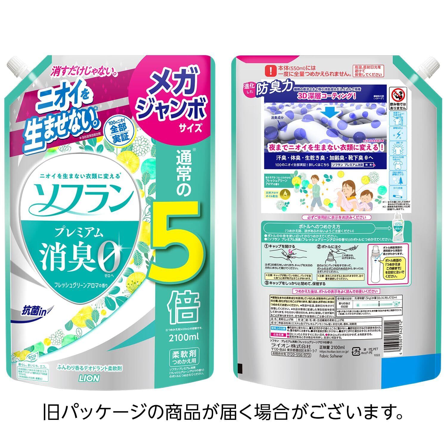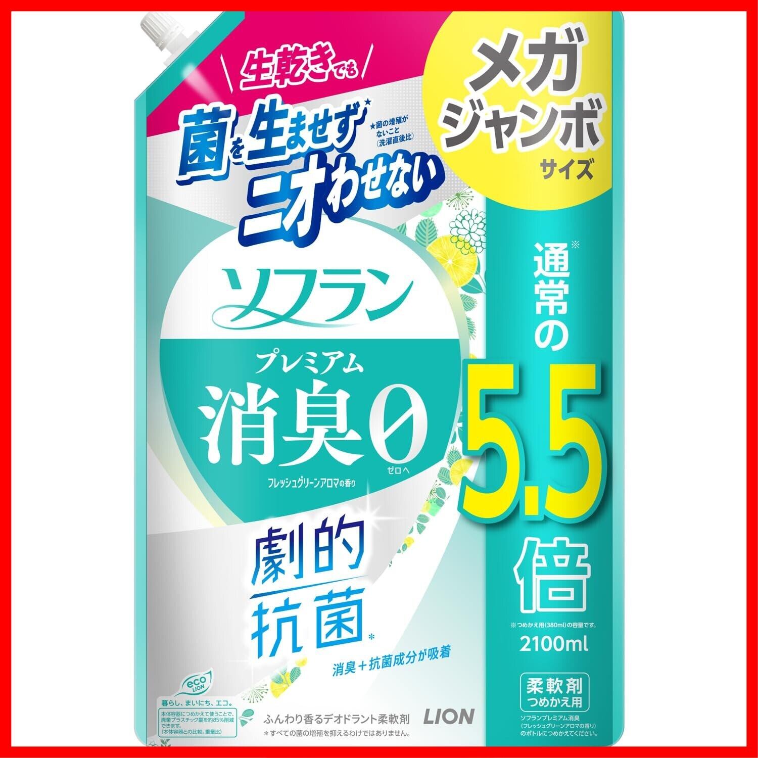 ソフラン プレミアム消臭 詰替メガジャンボ2100ml フレッシュグリーンアロマ 生乾きでも菌を生ませずニオわせない 柔軟剤 抗菌 部屋干し 汗臭 体臭 加齢臭 靴下臭