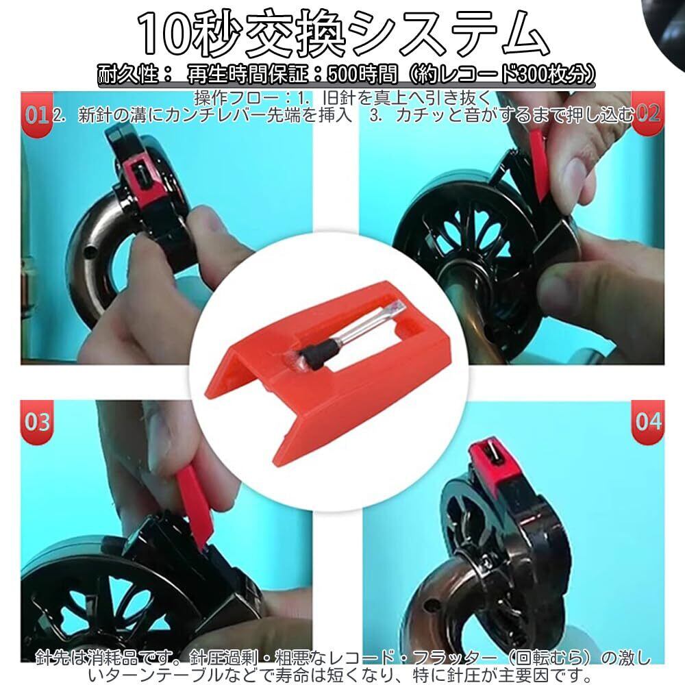 【10秒交換システム】:▼ 操作フロー:1. 旧針を真上へ引き抜く。2. 新針の溝にカンチレバー先端を挿入。3. カチッと音がするまで押し込む。▼ 耐久性: 再生時間保証:500時間(約レコード300枚分)。