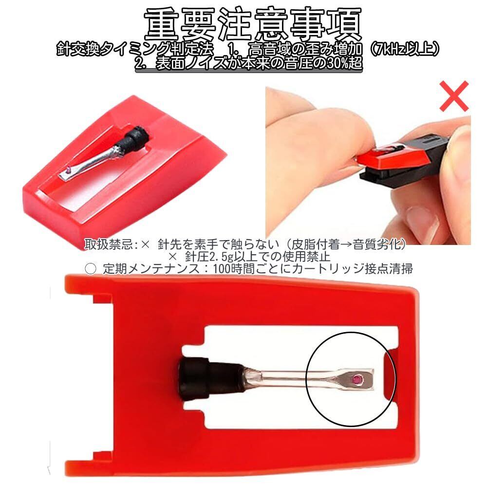 【重要注意事項】:■ 針交換タイミング判定法:1. 高音域の歪み増加(7kHz以上)。2. 表面ノイズが本来の音圧の30%超。■取扱禁忌:× 針先を素手で触らない(皮脂付着→音質劣化)。× 針圧2.5g以上での使用禁止。◯ 定期メンテナンス:100時間ごとにカートリッジ接点清掃。