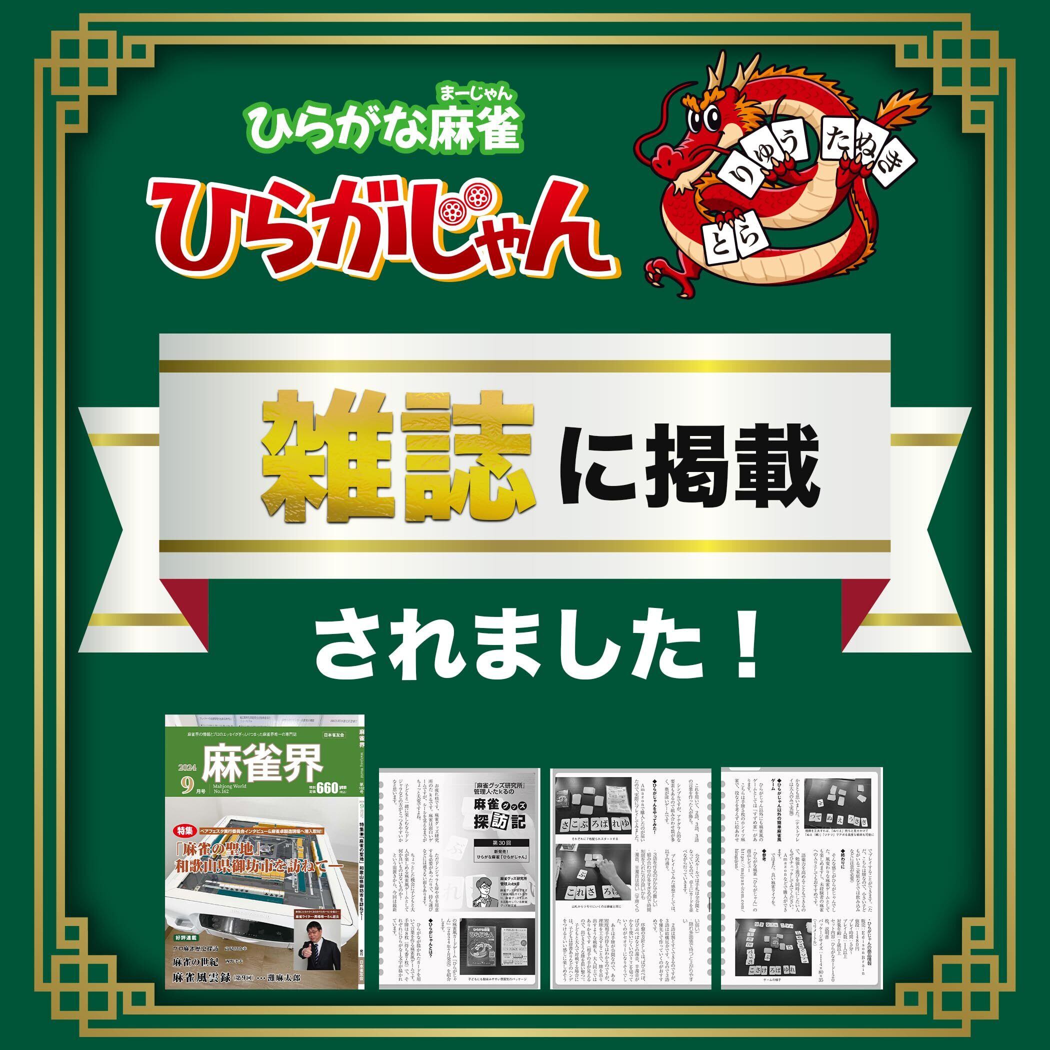 どこでも誰とでも楽しめる:麻雀は牌を置く広い場所が必要ですが、ひらがじゃんはカードならではの省スペースで持ち運びにも便利。自宅のローテーブルから旅行先までどこでも遊ぶことが出来ます。子どもは語彙力の向上、大人は頭の体操として楽しめます。家族や友人とのコミュニケーションツールにも最適です。