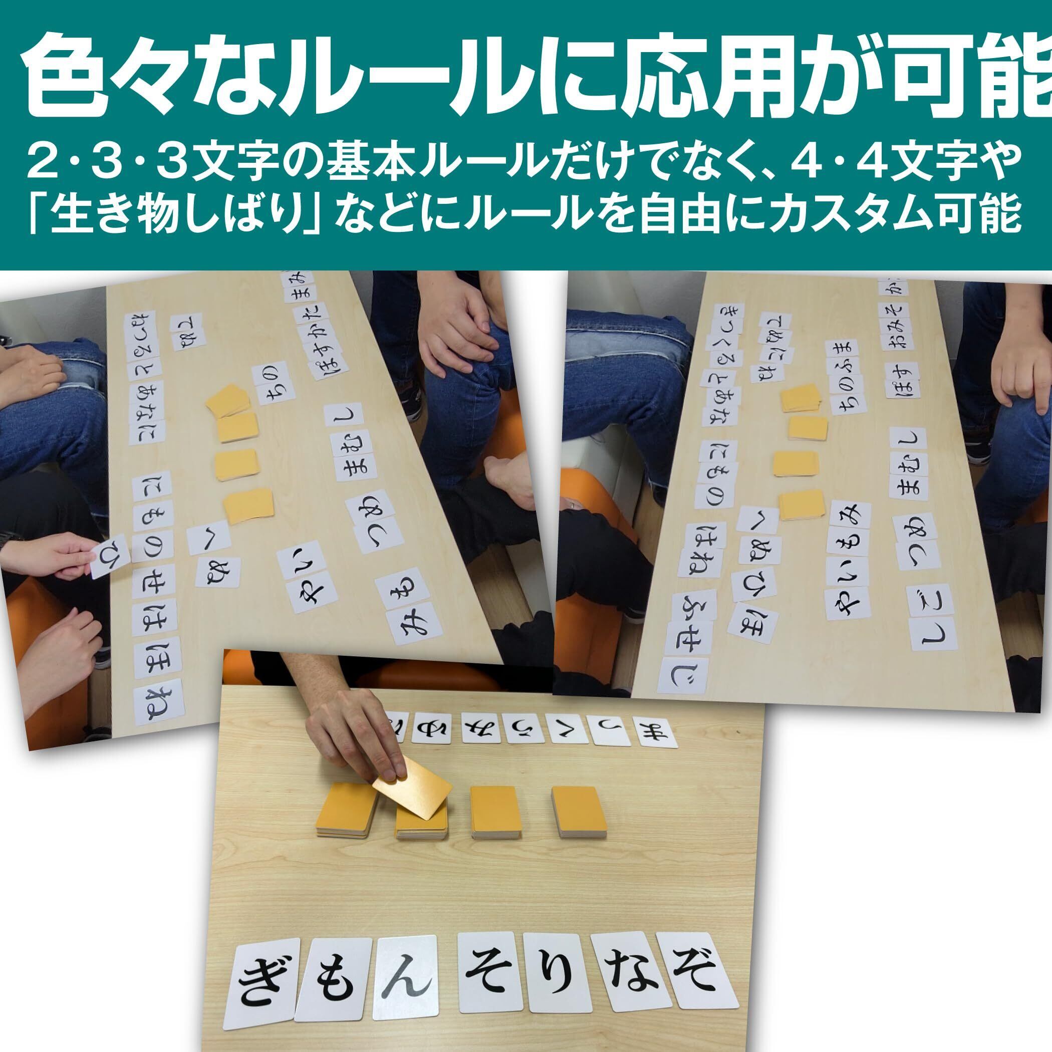 色々なルールに応用が可能:2・3・3文字の基本ルールだけではなく、4・4文字や「生き物しばり」「時間制限」などルールを自由にカスタムできます。プレイする人や人数に応じて柔軟にルール設定出来ます。