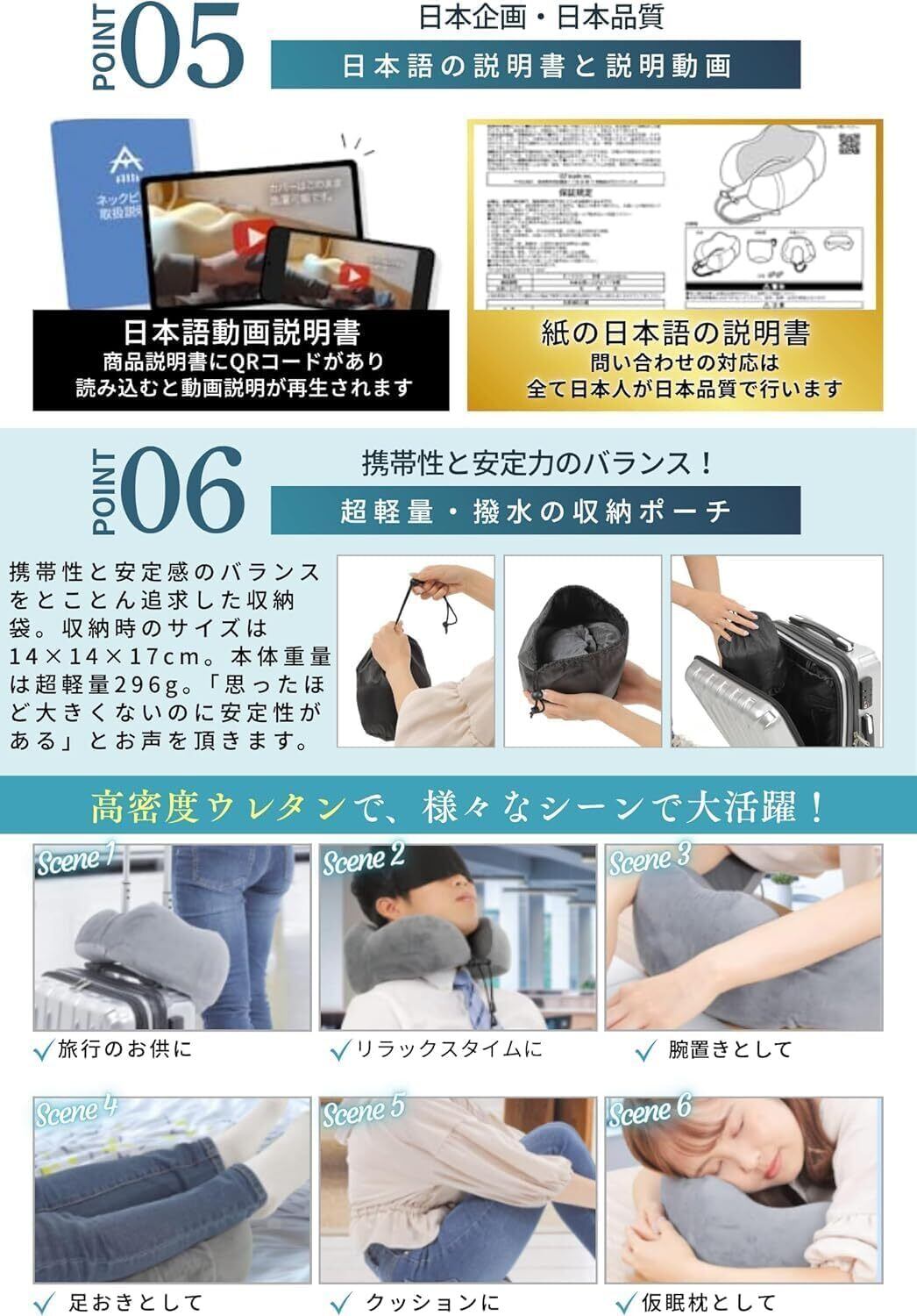 【軽量コンパクト】超軽量296gで小さく収納できる収納袋付き。専用の収納袋だけでなく、アイマスク、耳栓がついており、飛行機や車、深夜夜行バス、電車で快適に眠れる快眠グッズです。