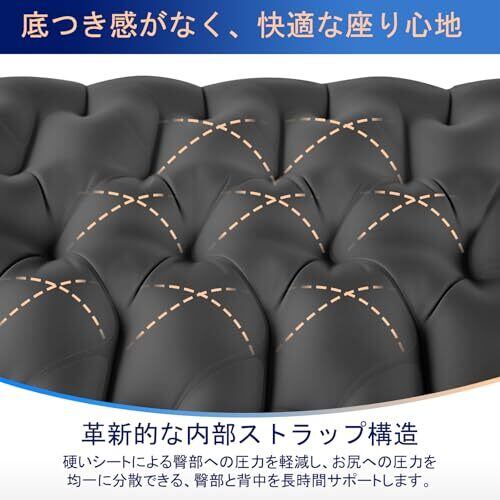 【底付き感なく、快適な座り心地】 エアー座布団の空気室の形状は革新的なエアセル構造を採用、尻がズレにくく、強力なサポートと快適な座り心地を提供し、お尻への圧力を均一に分散、底付き感がなく、座布団椅子やお尻クッションとして使うことで、長時間座ってもお尻が痛くならない快適さを実現。厚み約5cm、最大200kgの耐荷重で、レジャーシート 厚手 大判を敷いたようなふかふか感を、コンパクトに持ち運べるのがポイント、長時間座る方にとって、まさにゲームチェンジの一品です。