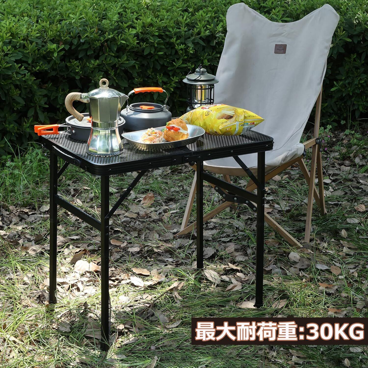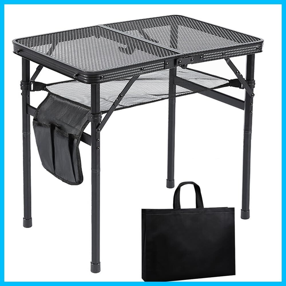 LEESA アウトドアテーブル キャンプ 二つ折り メッシュ天板 高さ調整 可能 2段階 耐荷重25kg 60×40 折りたたみ式 焚き火 アルミ合金 ソロ 安定 軽量 耐熱 組立簡単 コンパクト 多機能 携帯便利 屋外用 物置き 収納袋付き