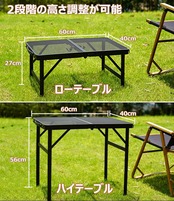 【商品仕様】テーブルの使用時サイズ:幅60cm×奥行40cm×高さ27/55cm。付属の継脚パーツで高さを2段階(ローテーブル・ハイテーブル)に変えて使用が可能。収納サイズ: 40cm×30cm×6.5cm。耐荷重:約30kg;耐熱温度:200度;重量:約3KG。