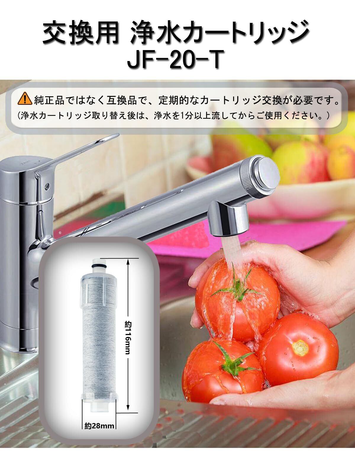 【対応形名】JF-20-Tオールインワン浄水栓取替用カートリッジです。一体型浄水栓 eモダンタイプ、FSタイプ、FNタイプ、壁付タイプ 交換用浄水カートリッジ 「JF-20-T」の互換性のある商品【純正品ではなく互換品です】。材質:活性炭素繊維と不織布とセラミック、サイズ:高11.6cm×幅2.8cm、 機能:水道水を濁り成分、カビ臭を除去し、抗菌性を発揮し、細菌の増殖を抑制します。