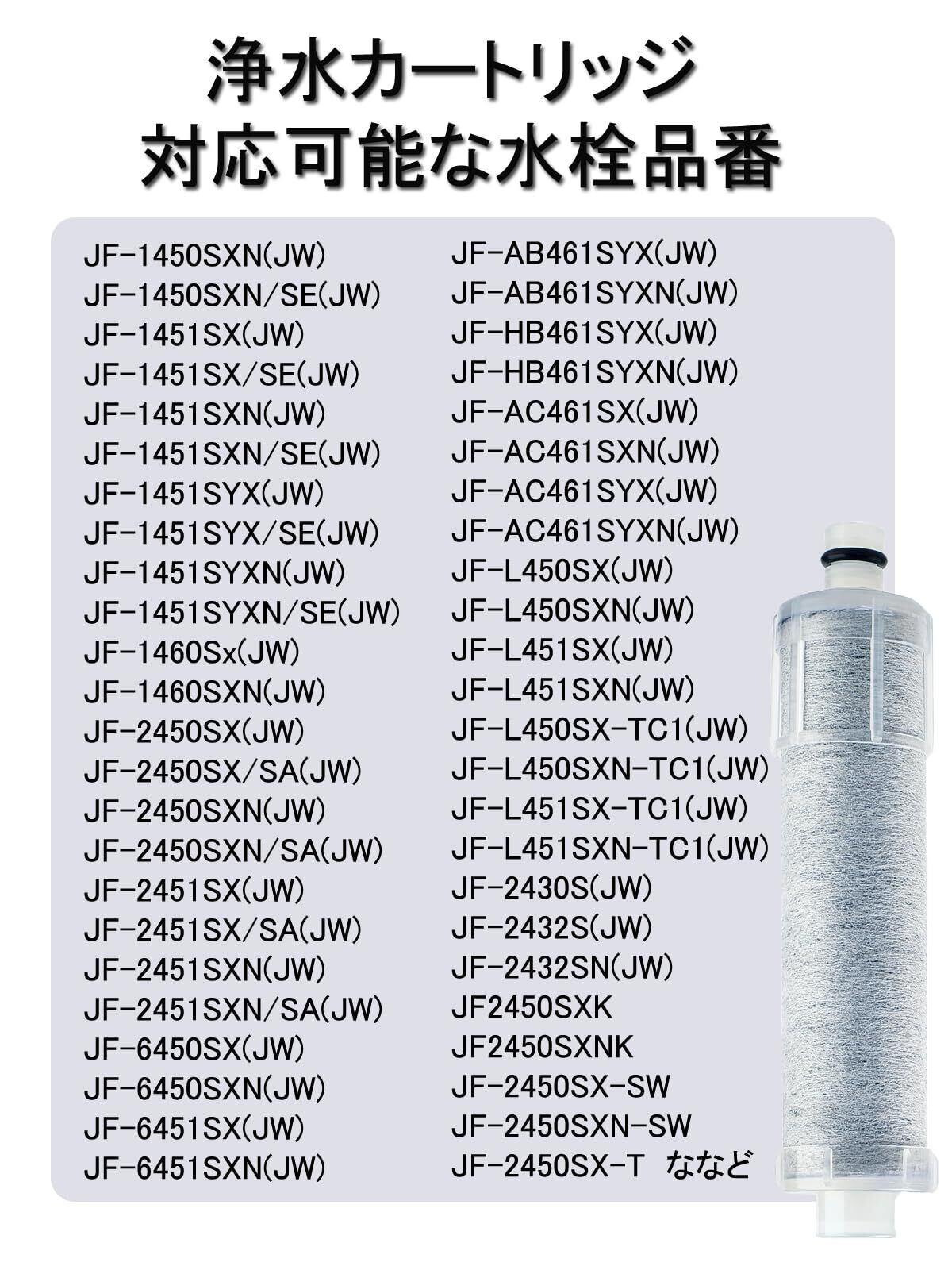 【水栓金具の対応品番】JF-301系、JF-145**/SE系、JF-AB466*-JG5Z系、JF-L45**-TB系、RJF-301系、JF-HB461系、JF-145系、JF-AB466*-JG6Z系、JF-L45**-TC(JW)系、RJF-302系、RSF-84系、JF-243系、JF-AB46系、JF-L45**-TC1系、RJF-303系、SF-T101系、JF-245**/SA系、JF-AC46系、JF-L45系、RJF-771系、SF-WL4系、JF-245**-KRP系、JF-AD46系、JF-S451SX系、RJF-772系、SF-WM4系、JF-245系、JF-AE46系、JF-T451系、RJF-86系、JF-645系、JF-AF43系、JF-AG44系、RJF-87系、JF-AF44系、JF-AH43系などに対応できるオールインワン浄水栓取替用カートリッジです。