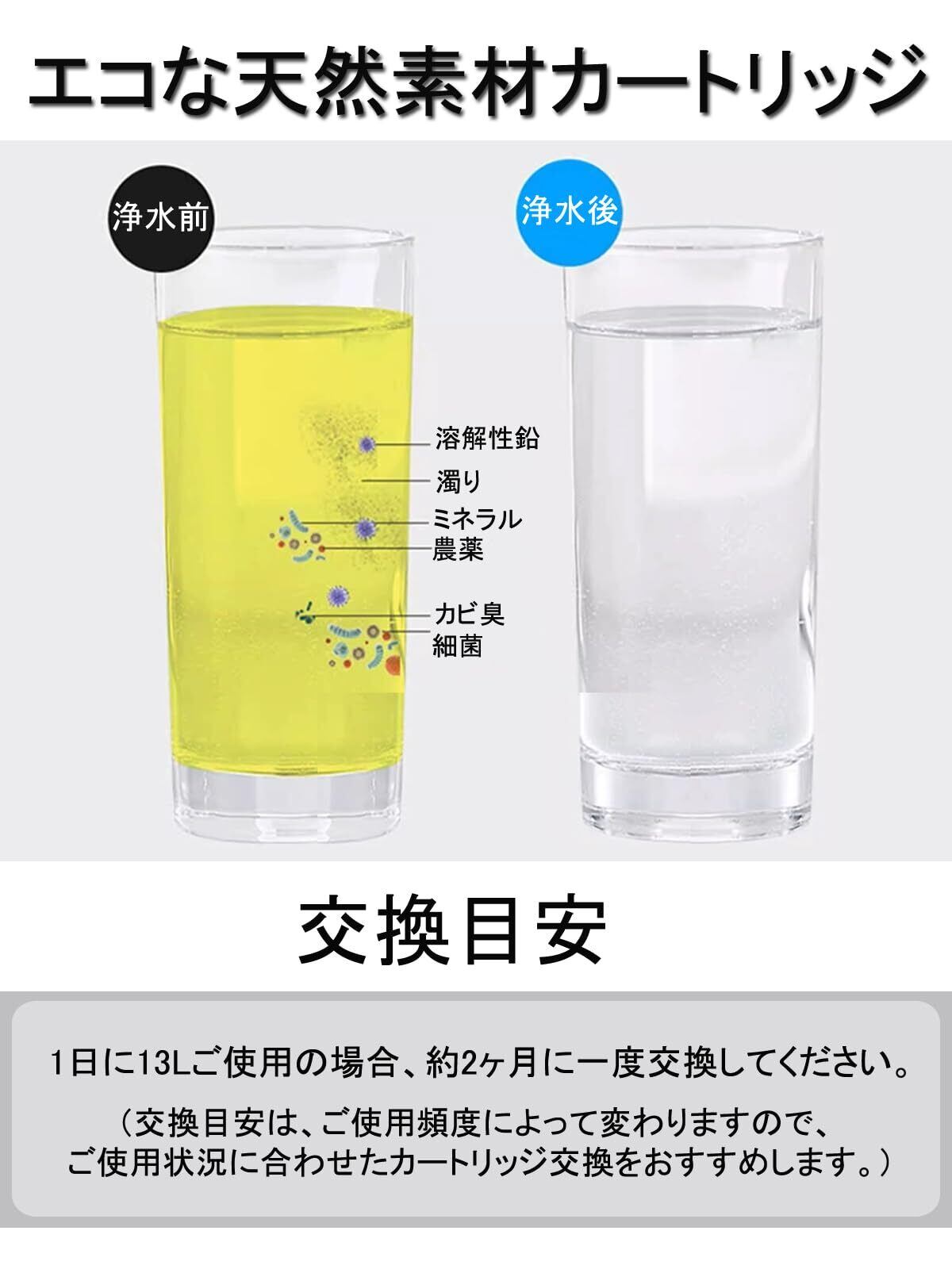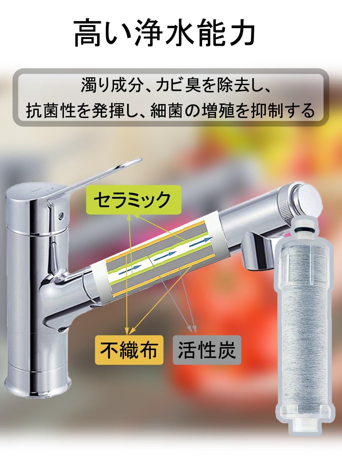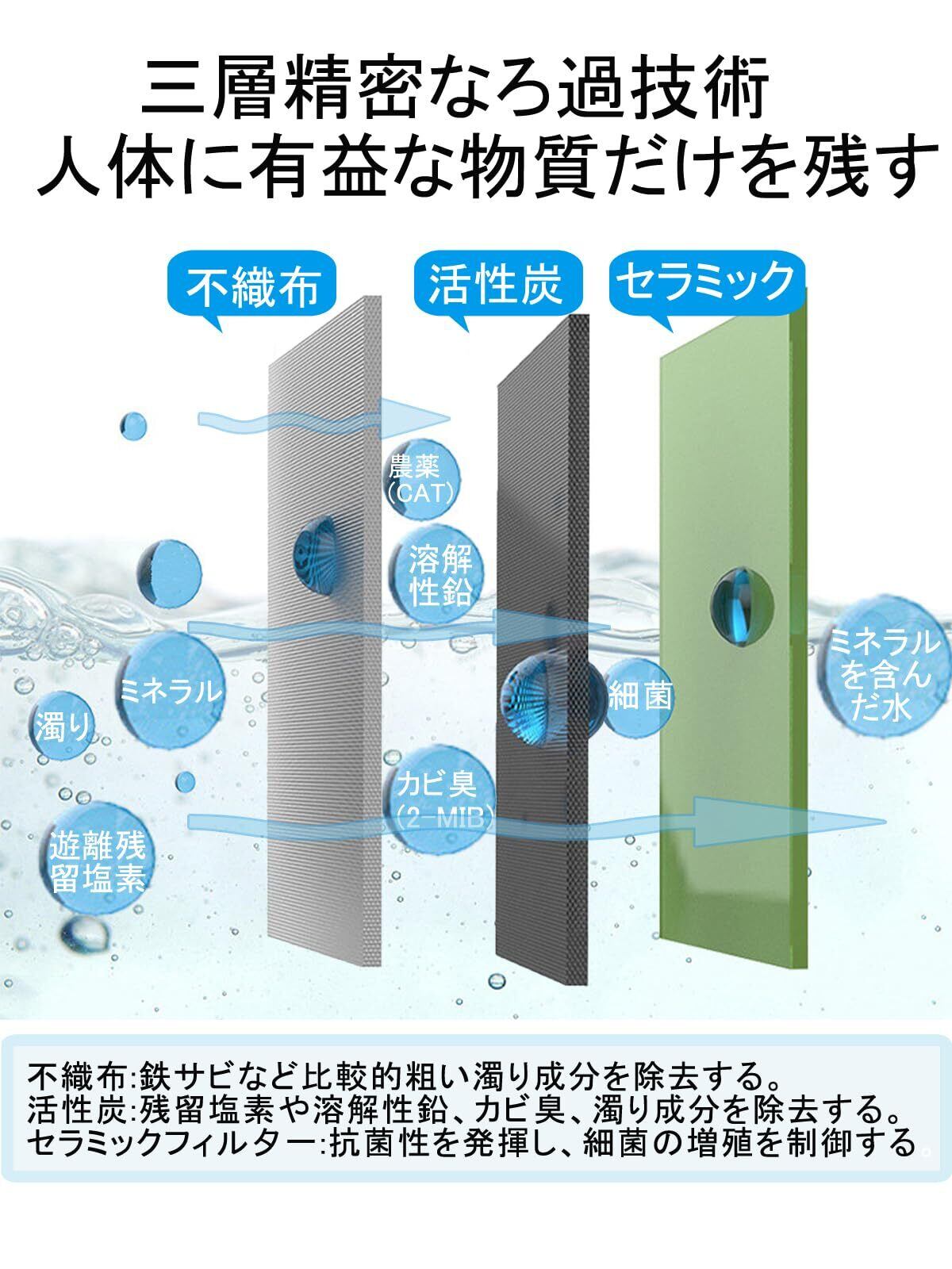 【高品質】浄水カートリッジはセラミック、活性炭(活性炭素繊維)と不織布97%天然素材を採用して、フィルター部に抗菌性があるため、カートリッジ内部で雑菌が繁殖しにくくなります、いつでも安心な浄水をお届けします。浄水カートリッジは5層フィルター構造で濁り成分、カビ臭を除去し、抗菌性を発揮し、細菌の増殖を抑制します