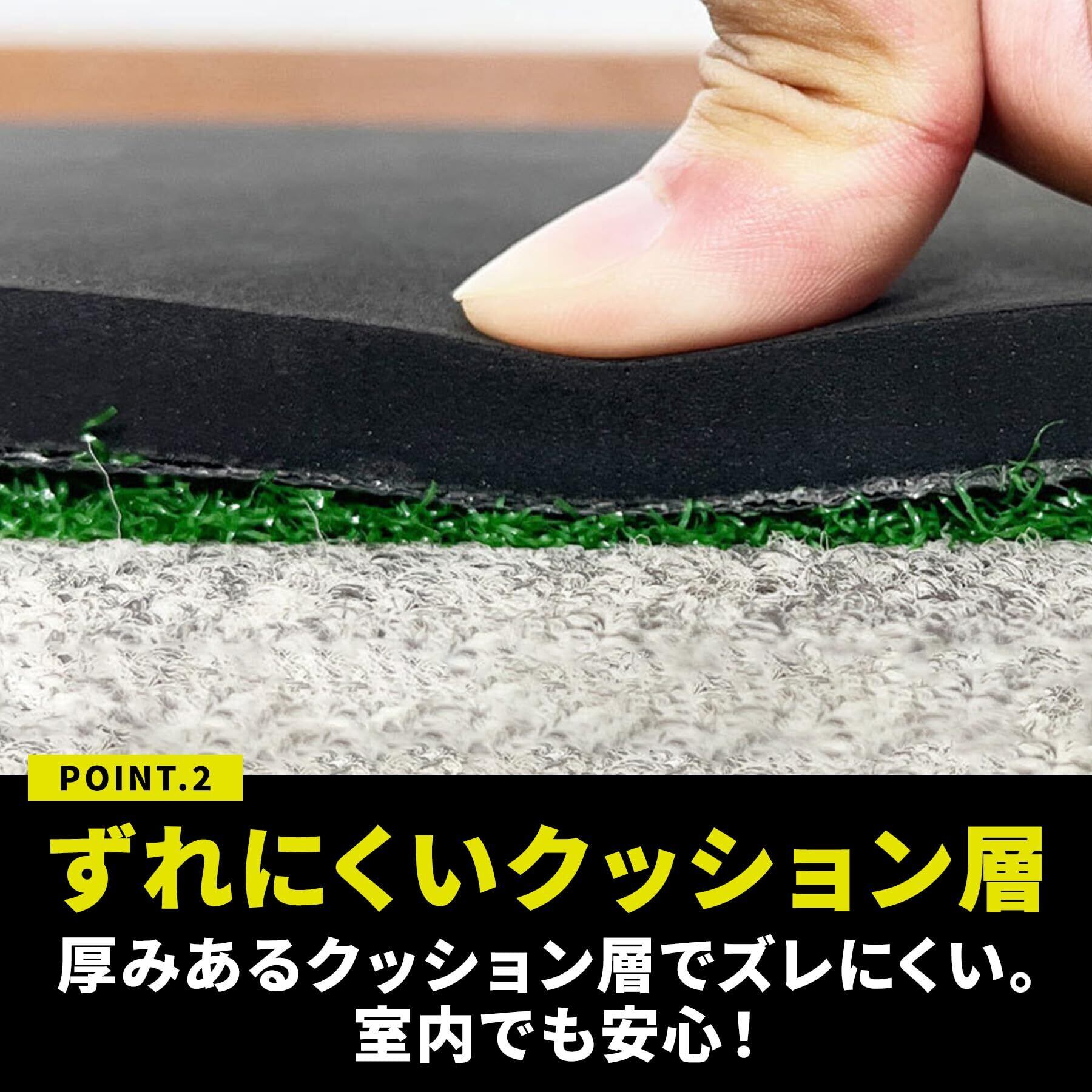 【衝撃吸収!自宅の床を傷付けない、厚みのある芝マット】芝風マットの裏面には滑り止め加工を施し、フローリングの上でショットしてもマットがズレにくい仕様。人工芝の下には厚みのあるスポンジを使用し、人工芝とスポンジによる2層構造により打った際の衝撃を吸収しやすい仕様。