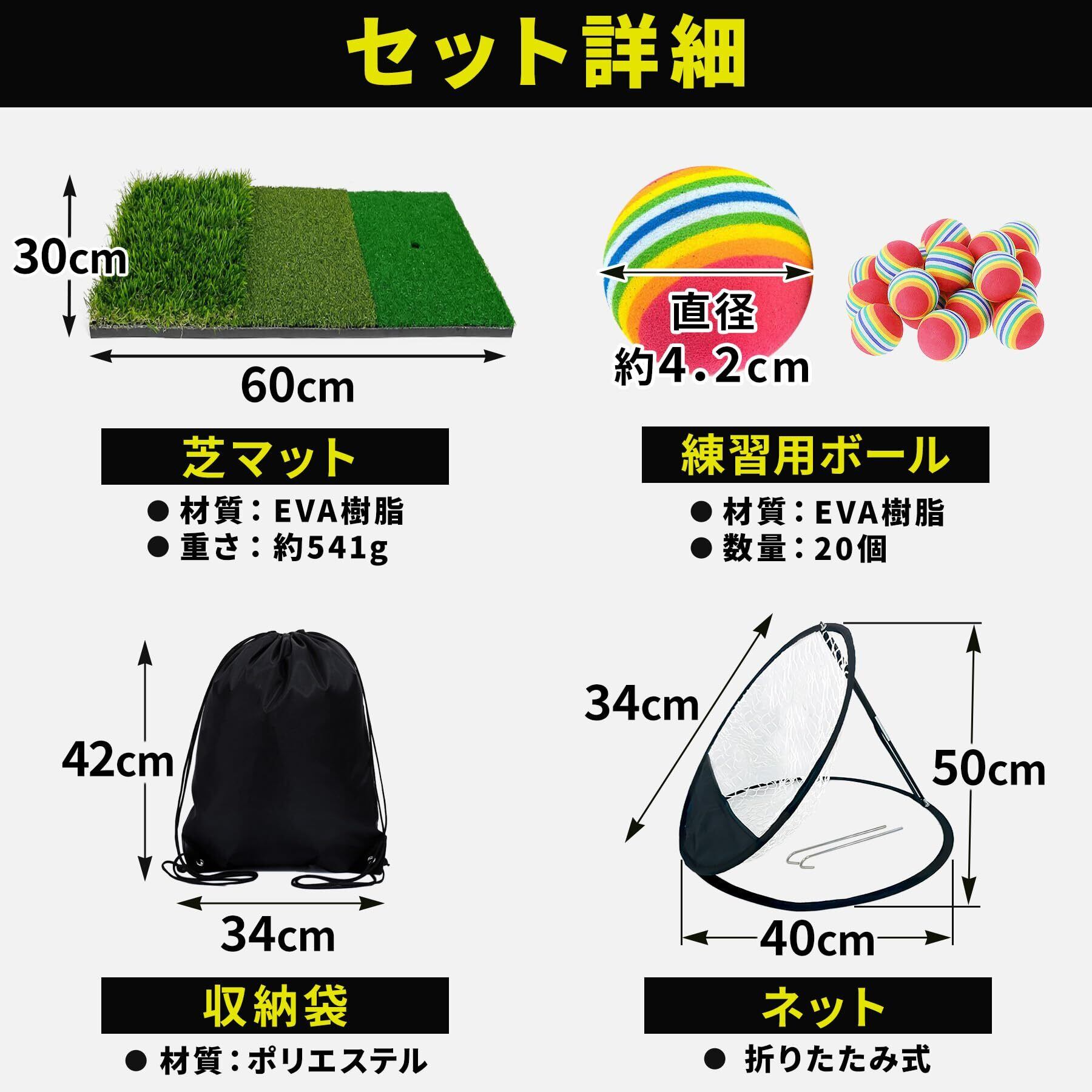 【製品情報】サイズ:人工芝600mm×300mm×18mm (人工芝10mm・SBRスポンジ8mm) ・アプローチネット500mm×500mm×400mm・ライン入りカラーボール20個 直径42mm EVA ・ポリエチレン製収納袋1枚 420mm×320mm ※モニターの環境等により、色の見え方に若干の違いがある場合がございます。