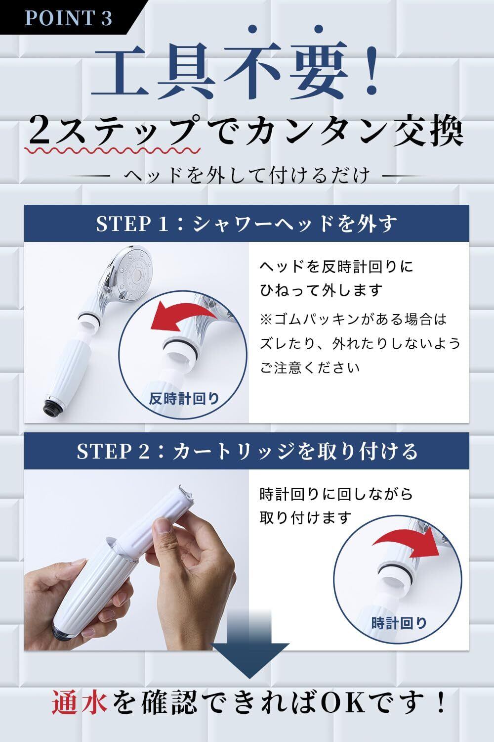 取り付けの際はシャワーヘッドを反時計回りにひねって外し、カートリッジを時計回りに回しながら取り付けてください。 なお、取り付けが不十分な場合、水漏れや正常に機能しない原因となる可能性がございます。 ご使用前にパッキンが正しく装着されているか必ずご確認ください。 また、ご使用のシャワーヘッド本体の状態や取り付け状況、水圧、給水環境等により、ろ過性能や使用感に差が生じる場合がございます。