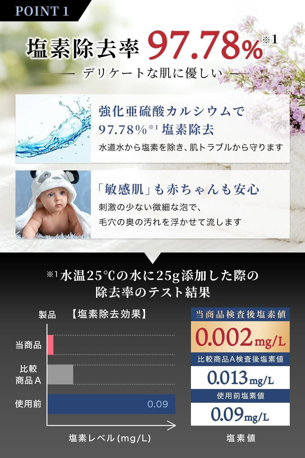 亜硫酸カルシウムにより水中の残留塩素を低減、弊社従来品より性能を強化したものを使用し、より効率的に塩素を除去(弊社従来品比)
