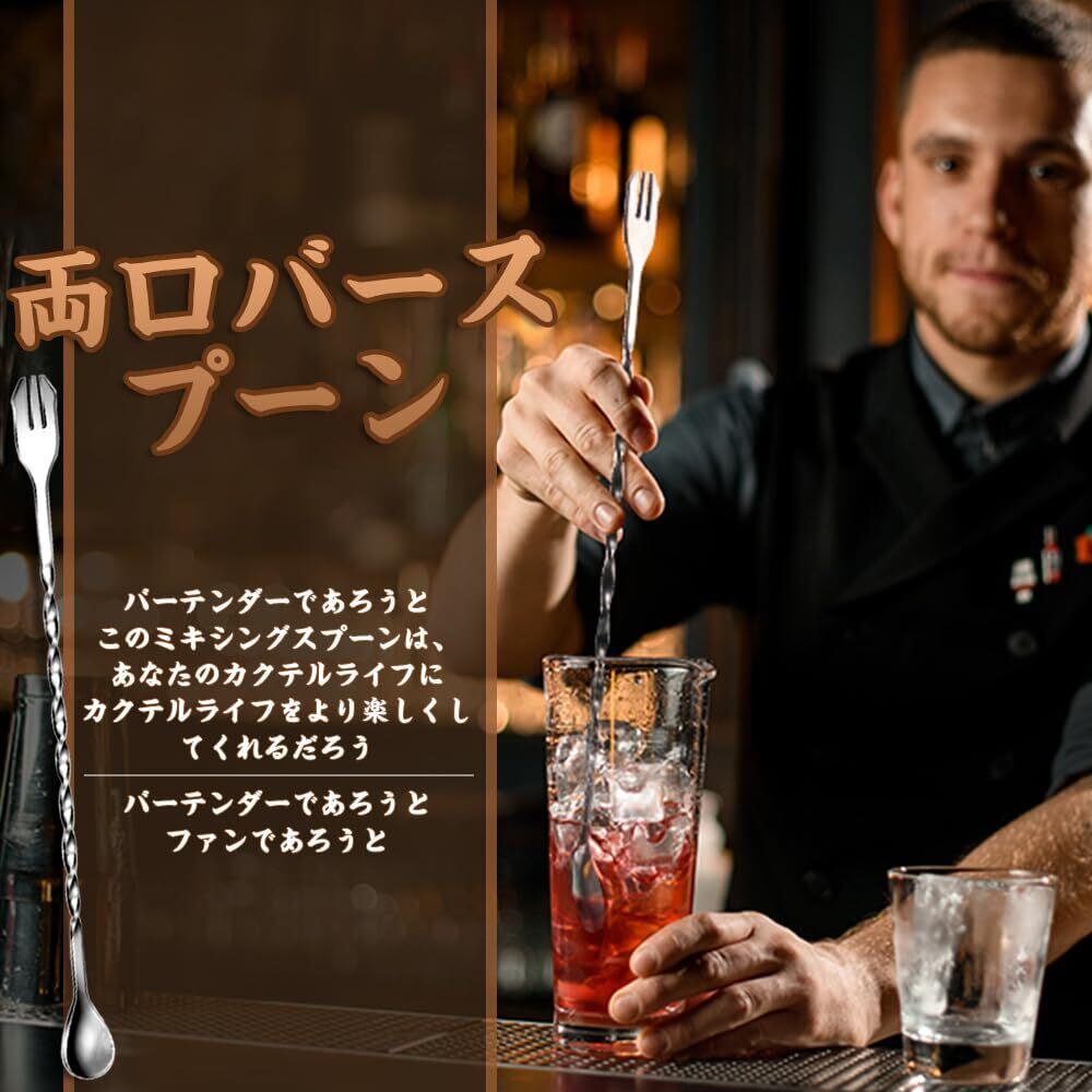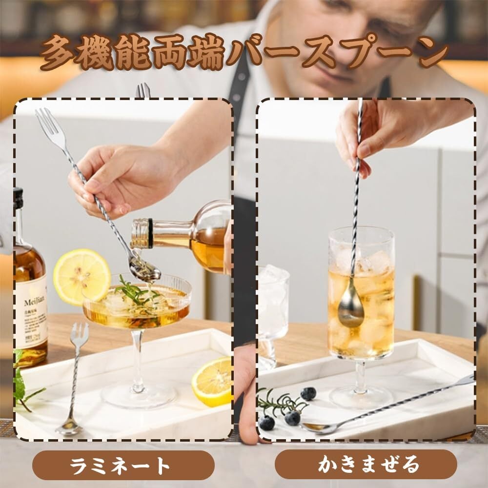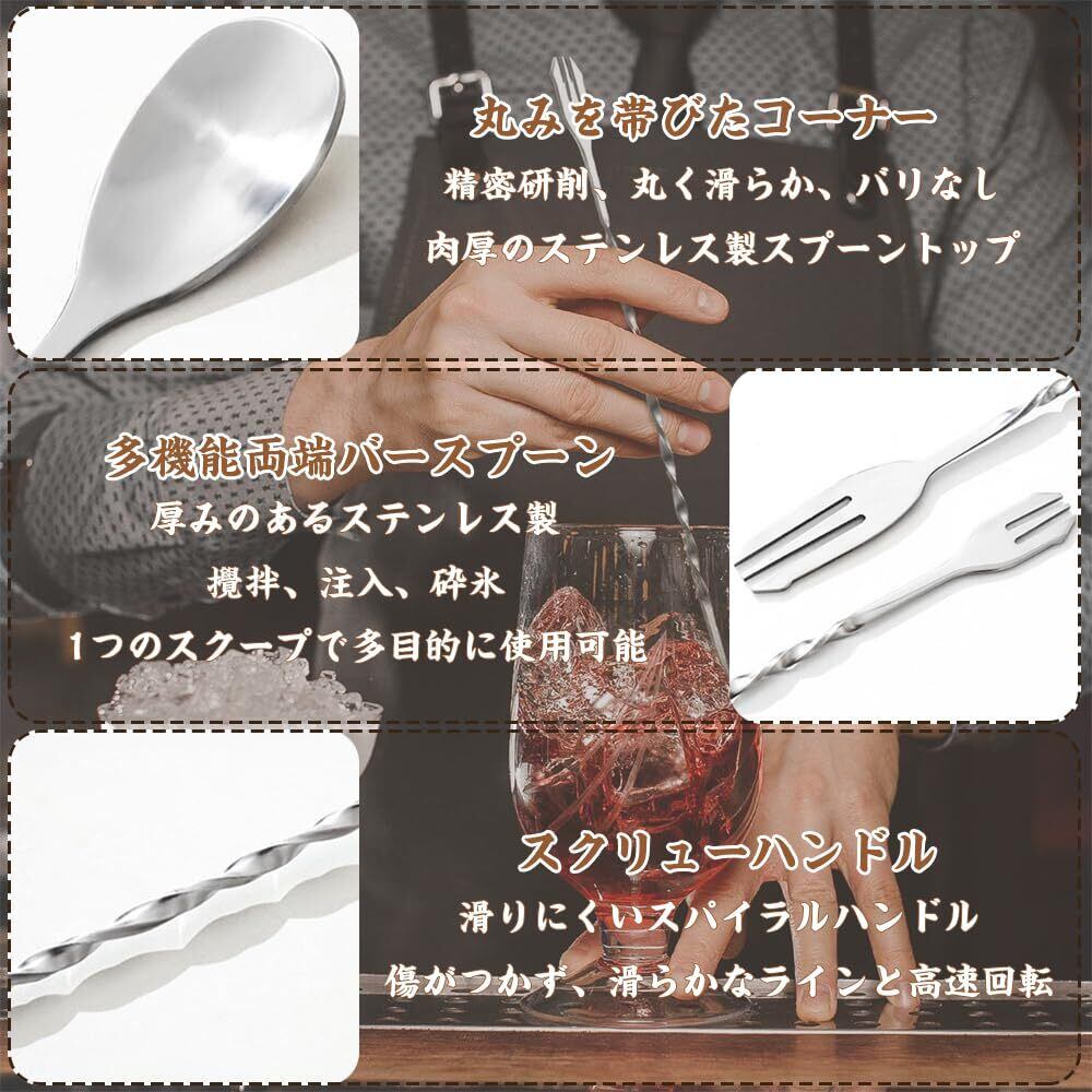 スタイリッシュなバースプーン:両端に異なる機能を備えたユニークなデザインで、フルーツを加えたり、角氷を砕いたりすることができます。 精密な螺旋構造により、回転感が最適化され、繊細な飲み物を作ることができ、プロのバーテンダーに理想的な操作体験をもたらす。