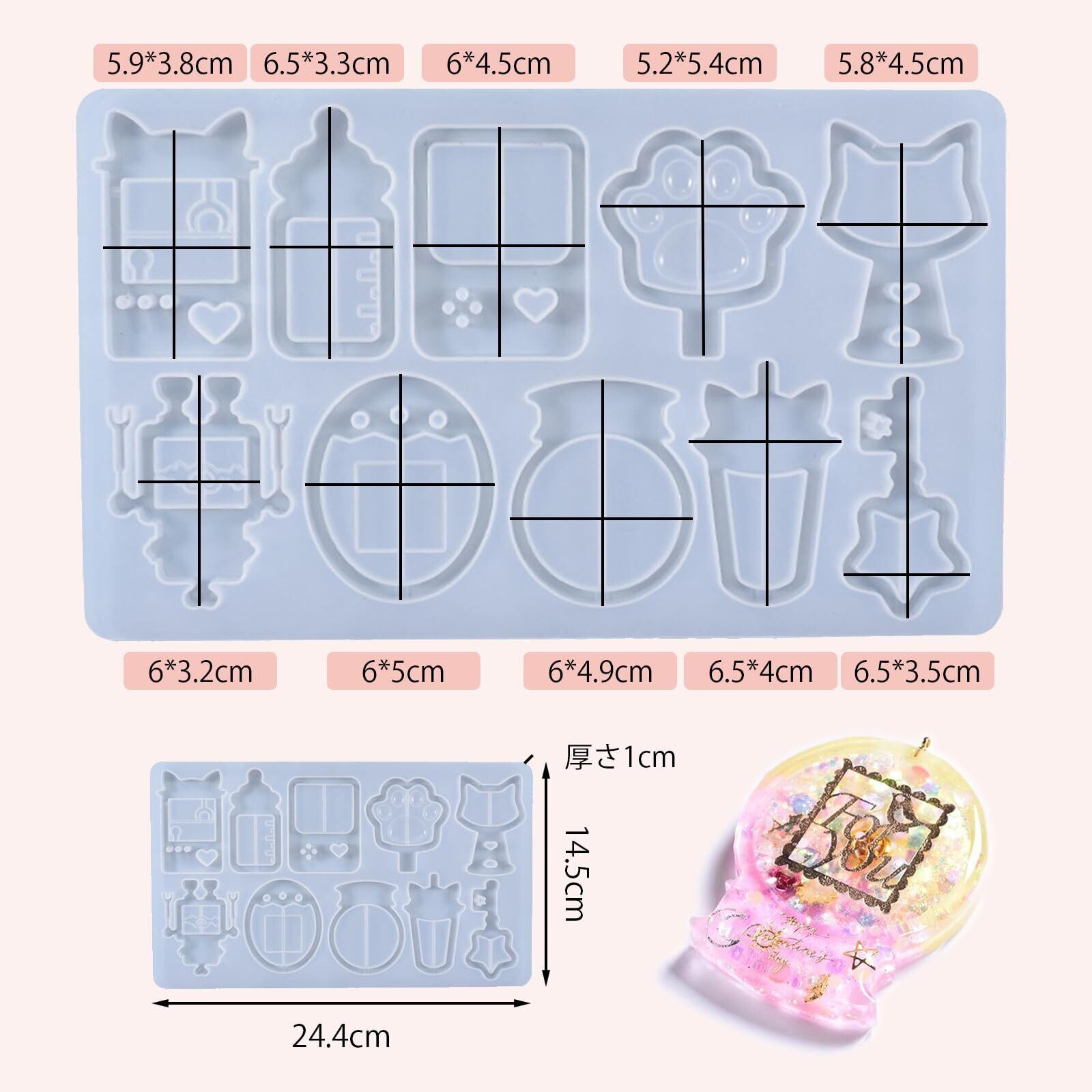 【多様な種類】全10種類の砂時計型の型。かわいい流砂シリコンモールド。キャッチャー、ミルクボトル、四角いゲーム機、猫の耳、ロボット、卵形、ゲーム機、ガチャ、飲料瓶、星形のキーなど、様々な形状とサイズがあり、様々な楽しみを味わえます。