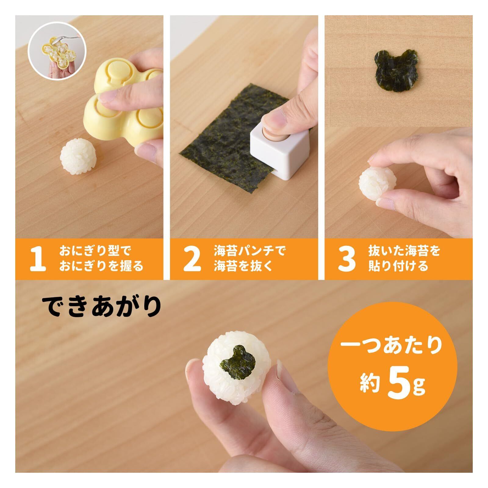 ●セット内容:おにぎり型×1、海苔パンチ2種×各1、取扱説明(台紙記載)●おにぎり型:[本体サイズ](約)幅5×奥行7.5×高さ3.5cm、[重量](約)24g、[材質]ポリプロピレン(耐熱温度120℃)●海苔パンチ(共通):[本体サイズ](約)幅2.5×奥行2.5×高さ3cm、[重量](約)26g、[材質]ABS樹脂、亜鉛合金