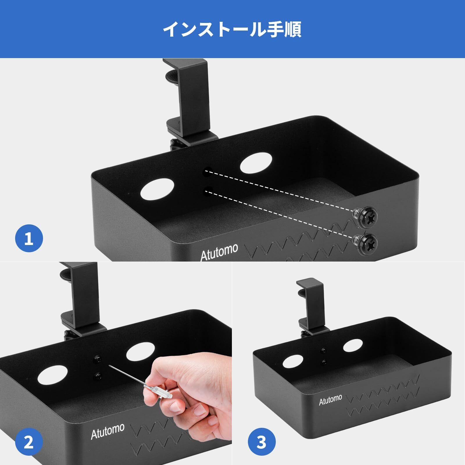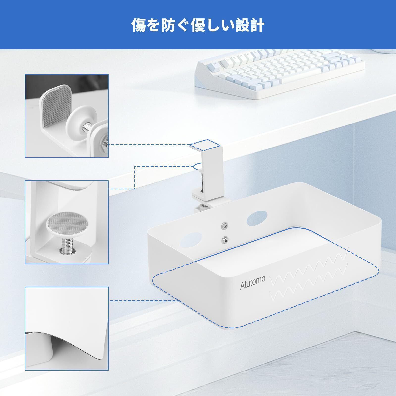 優しいデザイン設計:1.テーブル下収納ラックは後ろに2つケーブル管理する穴があり、この穴を通じて携帯電話に充電ができます。2.収納ボックスにPUクッションパッドも付き、小物を傷防止です。3.固定クリップの内側に高品質の緩衝材を追加しました。安心してご利用ください!