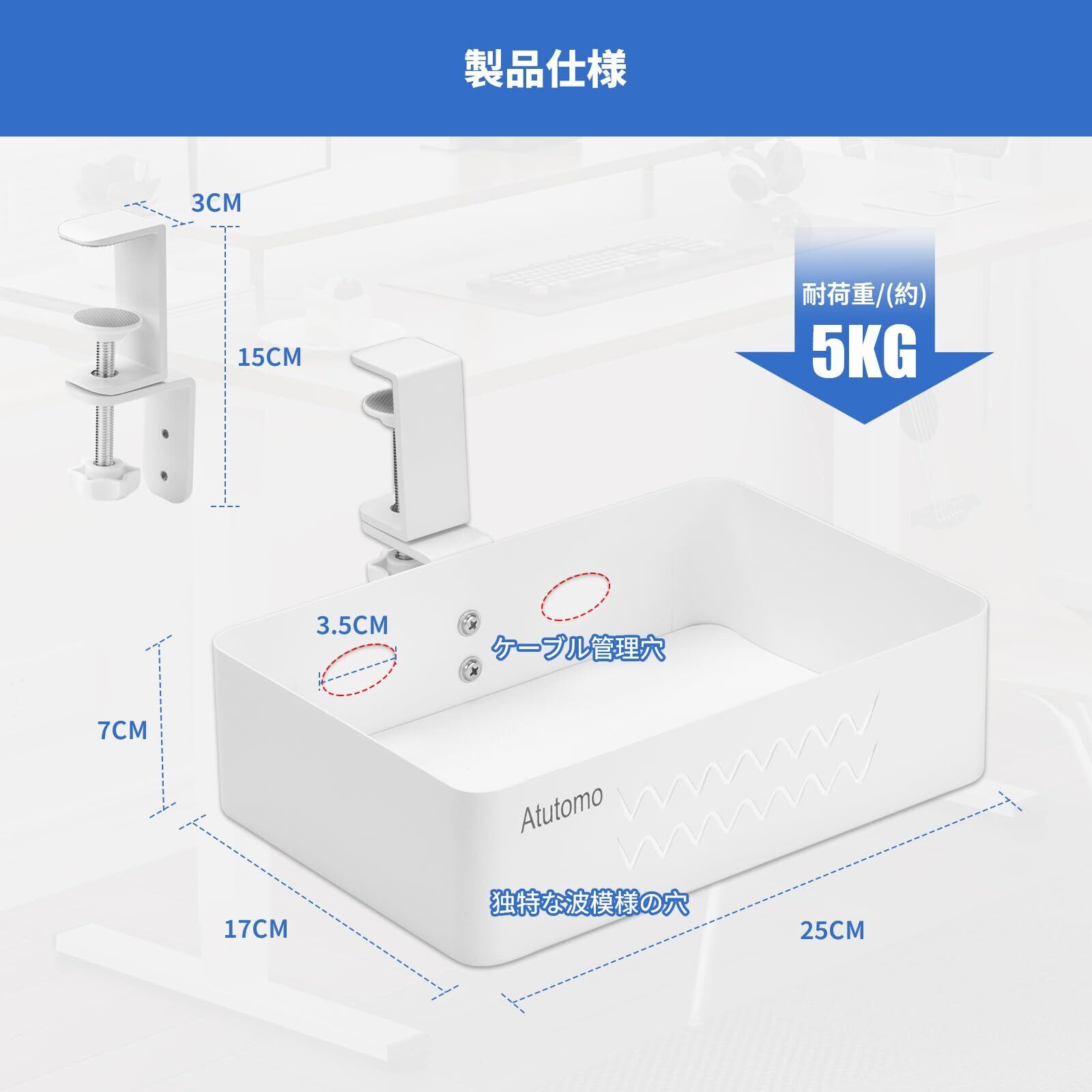 製品仕様:収納ボックスサイズ/(約)250×170×70mm、最大耐荷重/(約)5kg。デスクや机などの厚さに合わせて幅を調節して、5cmまでの天板の厚さに対応可能です。