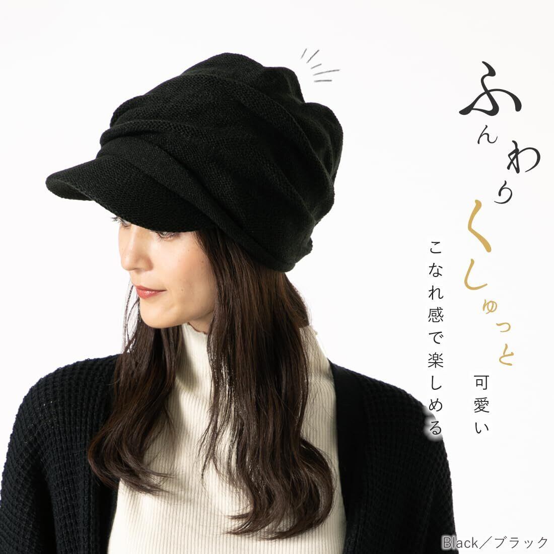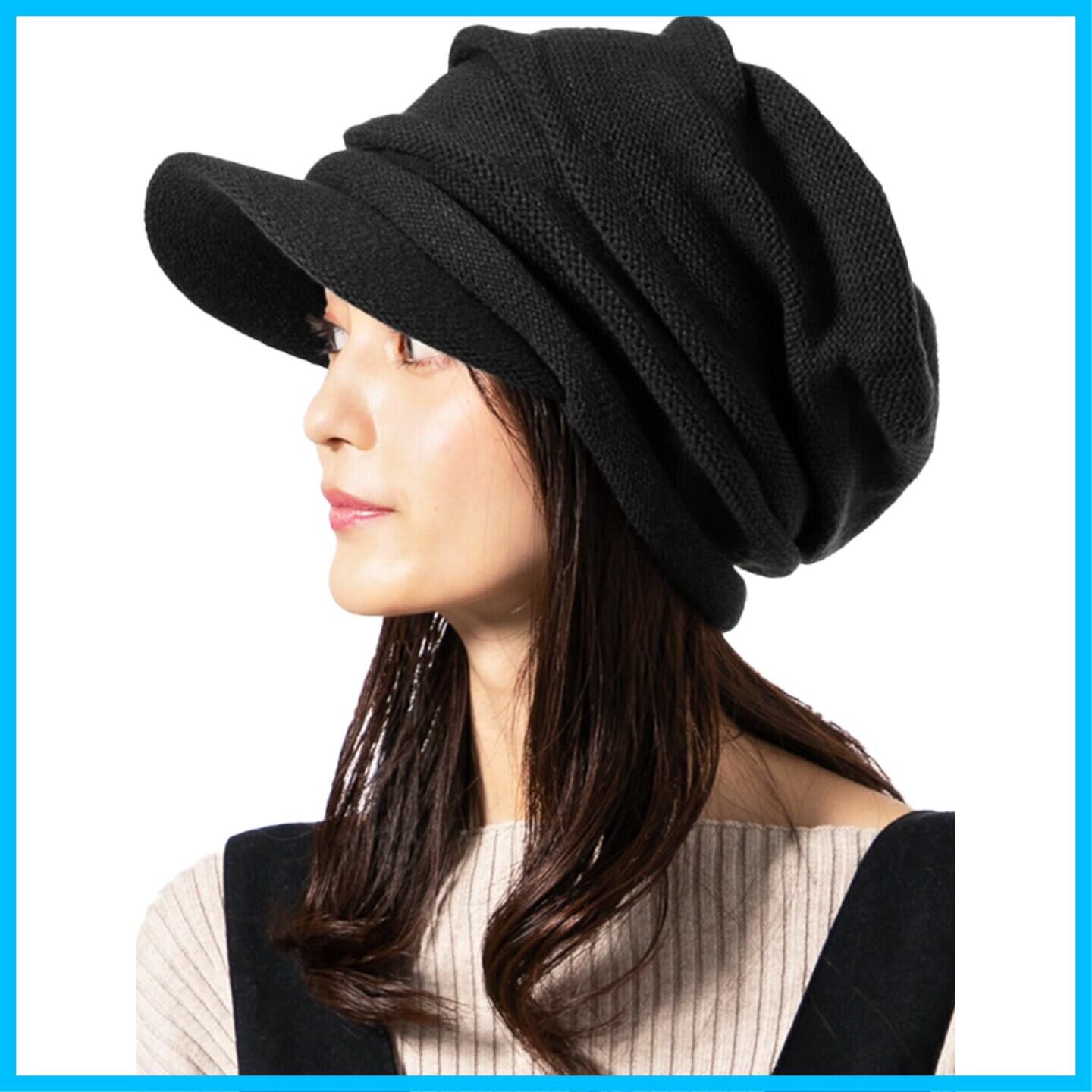 [QUEENHEAD] クイーンヘッド 小顔効果 くしゅっとニットキャスケット 帽子 メンズ レディース 大きいサイズ つば付き ニット帽 つば広 UV 秋冬 防寒対策 【フリーサイズ(約57-63cm)-ブラック】