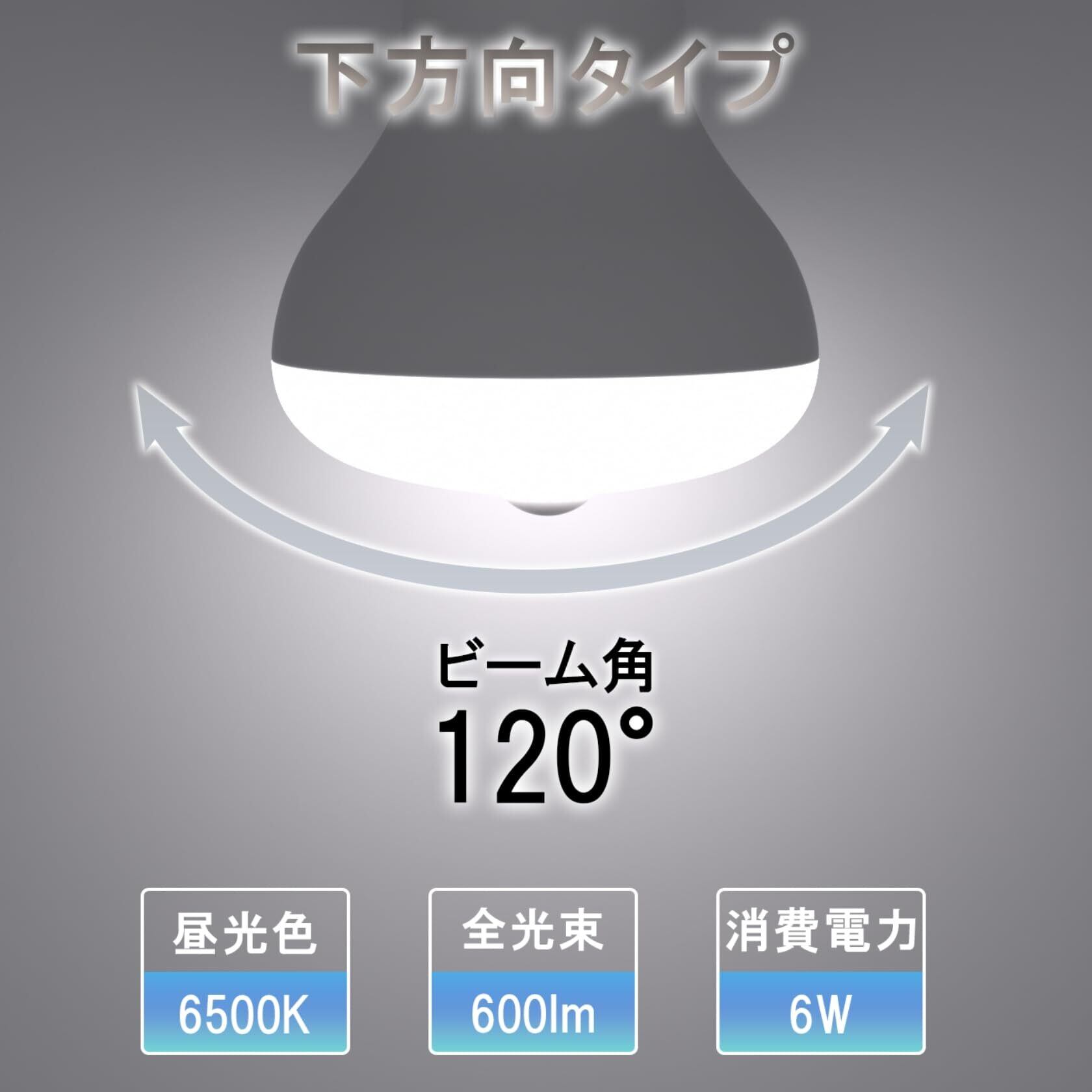 【商品仕様】● 寸法:全長102mm、最大径63mm● 質量:55g● 定格電圧:AC100V(50/60Hz)● 定格消費電力:6.0W● 待機消費電力:0.2W● 全光束:600 lm● 色温度:昼光色(6500K)● 平均演色評価:Ra82● 定格寿命:25000時間● 口金:E26● 検知角度:約120°● 検知範囲:半径約2.5m