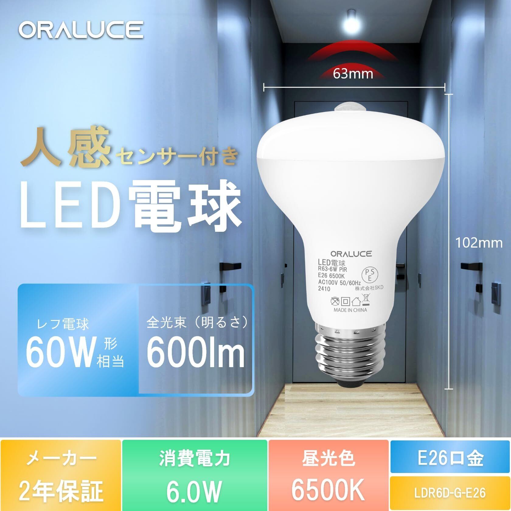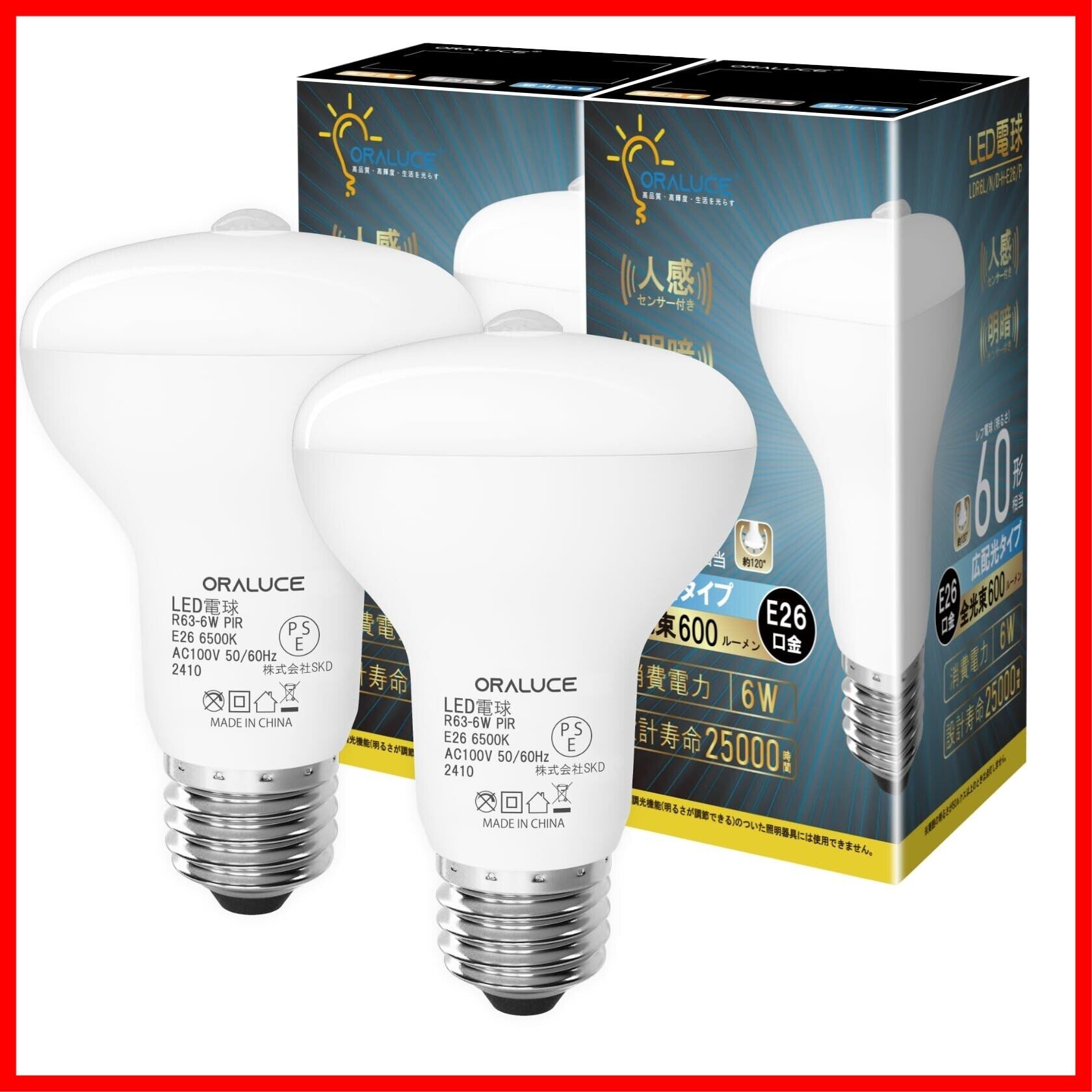 ORALUCE LED電球 E26口金 人感センサー 電球 レフランプ形 60W形相当 昼光色 6500K 6W 600lm 自動点灯・消灯 明暗センサー付 消し忘れ防止 階段 玄関 廊下 トイレ 調光不可 2個入 LDR6D-G-E26