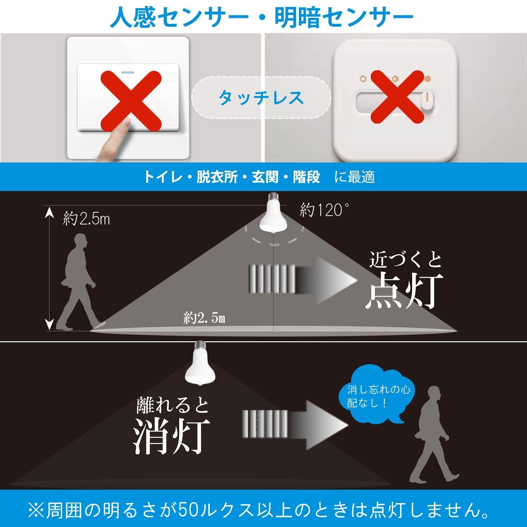 【自動点灯・自動消灯】人感センサー搭載のLED電球。人の動きを検知して自動で点灯します。人の動きがなくなると約90秒後に自動消灯します。点灯中、80〜90秒の間に徐々に減光、90秒で完全に消灯。消し忘れの手間や夜間の点灯の不便を解消。ご注意:人・動物などが動きを検知し続けると、ライトが点灯し続ける。途中で暗くなってしまう心配がない。