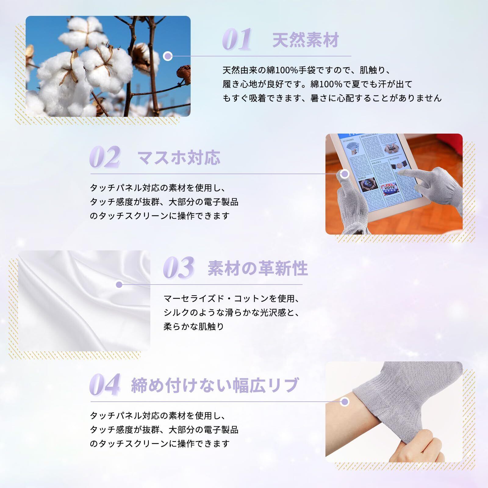 【天然素材】天然由来の綿100%手袋ですので、肌触り、履き心地が良好です。綿100%で夏でも汗が出てもすぐ吸着できます、暑さに心配することがありません。