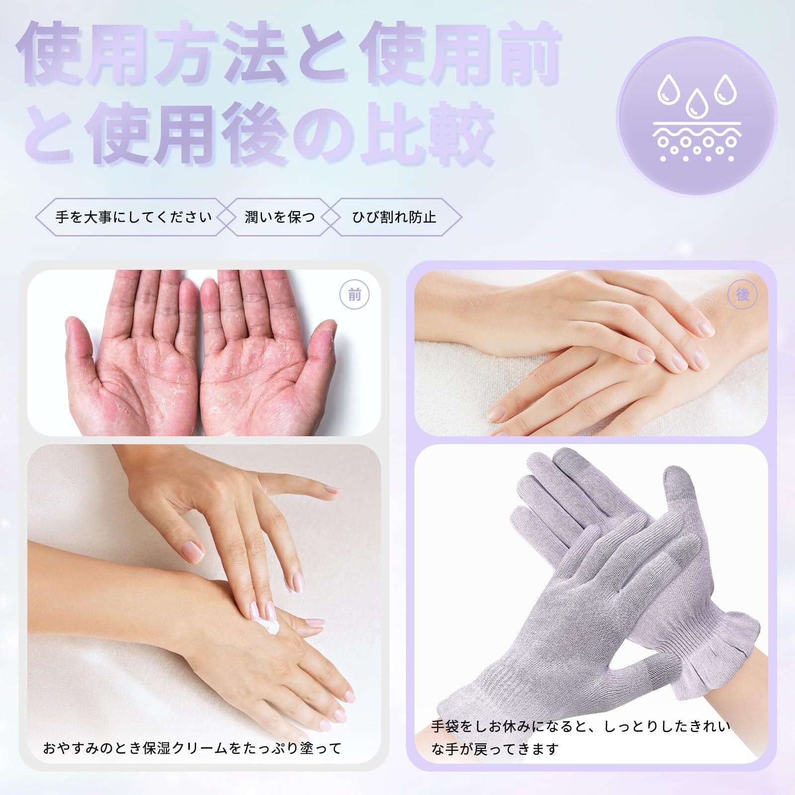 【幅広い用途】外出・ドライブ時の紫外線防止、コロナウイルス対策、接触感染予防、就寝時の保湿ケア、水仕事時の肌荒れ対策、主婦湿疹・冬の寒さ&乾燥対策・など、オールシーズン・昼夜問わず活躍します。誕生日・クリスマス・母の日等のプレゼントにもピッタリです。