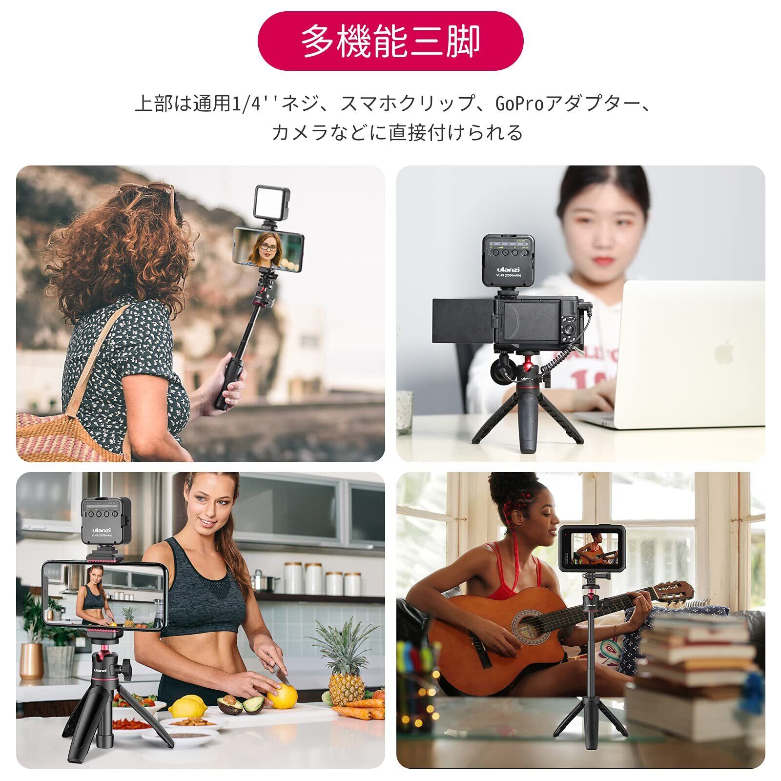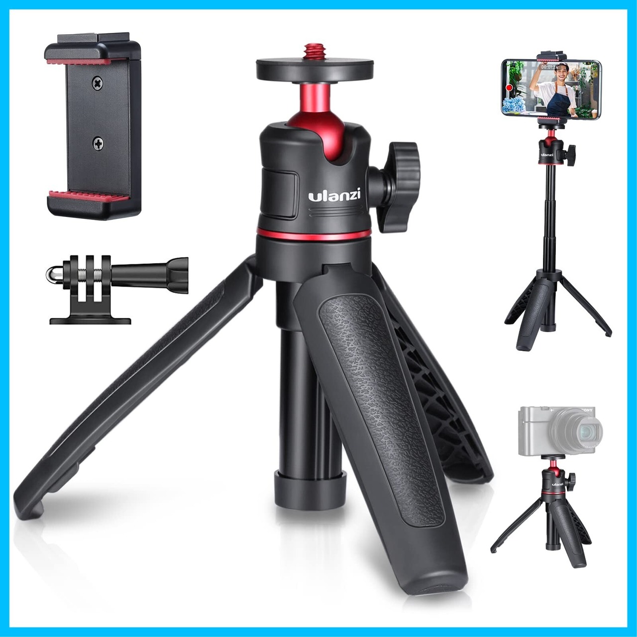 【軽量で頑丈&360度調節】】Ulanzi Vlog 三脚はわずか90gと超軽量です。耐荷重は1kgです。 このセルカ棒はABS + Aluminum素材を採用した、非常に頑丈で安定性あります。GoPro用三脚はボールヘットを使用し、360度回転可能、カメラの角度を最大90度まで調整でき、被写体に応じて、お好みの角度、縦や横を自由に使い分け、クオリティーの高い写真が撮れます。