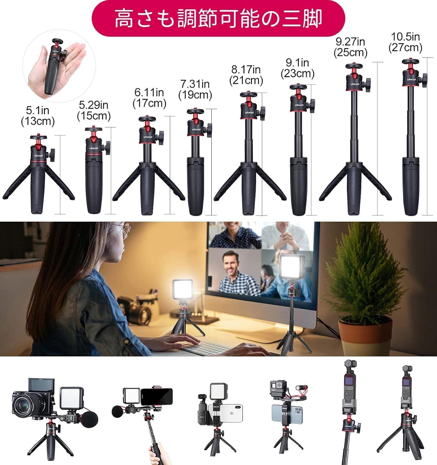 【3段自由伸縮&コンパクト】三脚は3段階の伸縮式を採用されており、13cmから最長27cmまで伸ばすことができます。収納サイズはわずか15cm、簡単にバッグに入れて持ち運び超便利です。移動が多い撮影や荷物の重さを減らしたい方におすすめ。