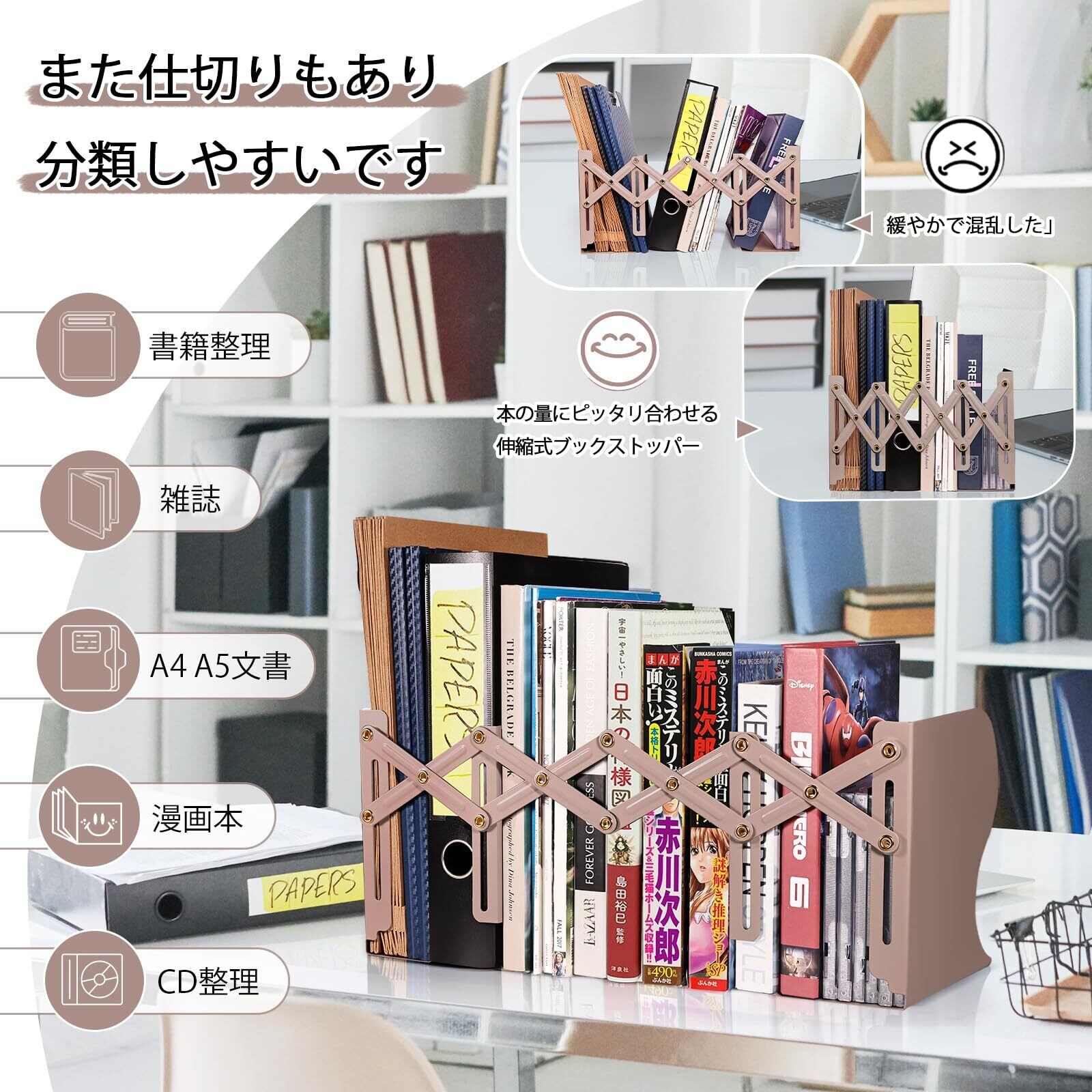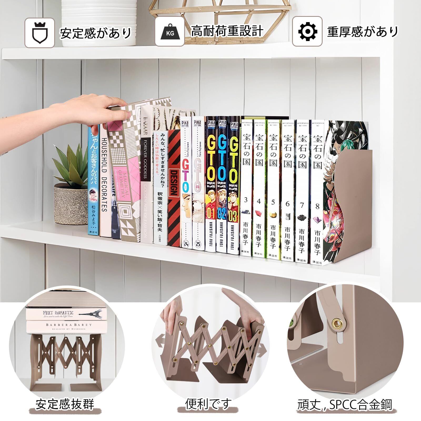 【ブックエンド伸縮】最大幅は50cmまで調整できます。スッキリとおさまり、左右本の量にあわせて調整できるのが使いやすいです。取り出しも簡単です、本の数量によって自由に調整できるので、スペースを節約します、サイズが大きくてより多くの本を収納できます、スペースを最大に活用できます