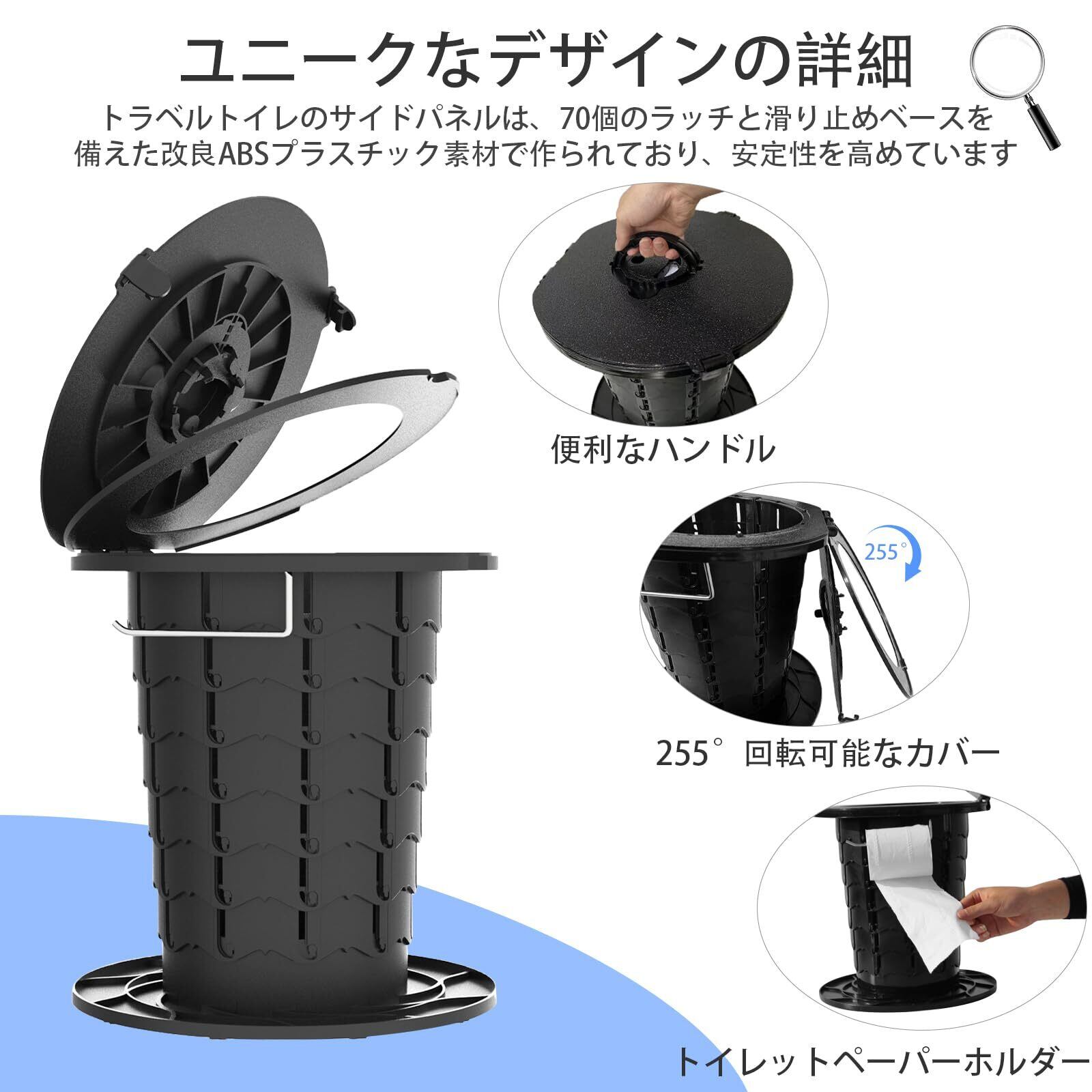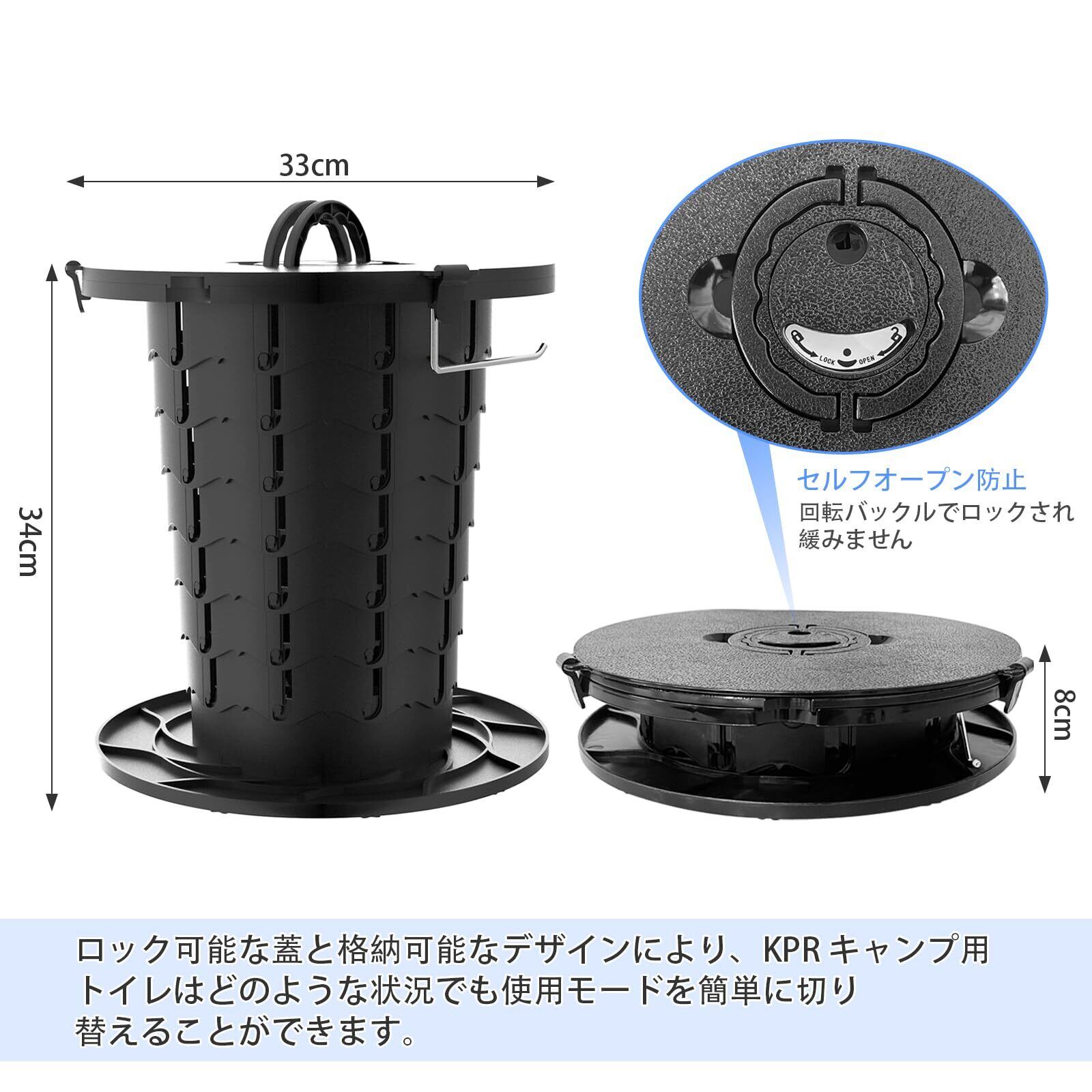 ポータブルで使いやすい:ポータブルトイレは、ラッチを時計回りに回して引くだけで、簡単に広げることができます。 折りたたみ式トイレは持ち運びも収納も簡単です。 フタにはハンドルが付いており、折りたたんでも広げても、簡単に持ち運びや移動ができます。