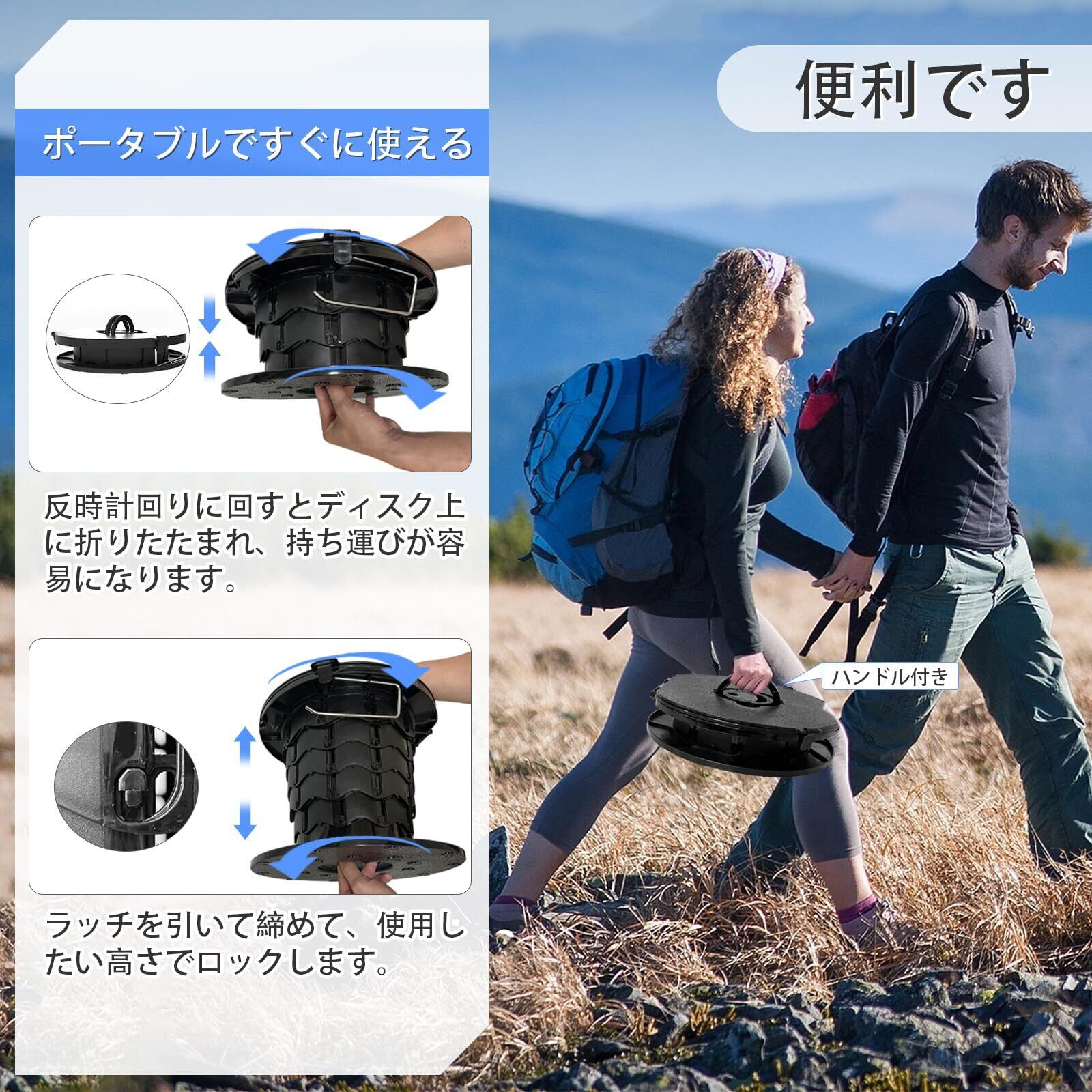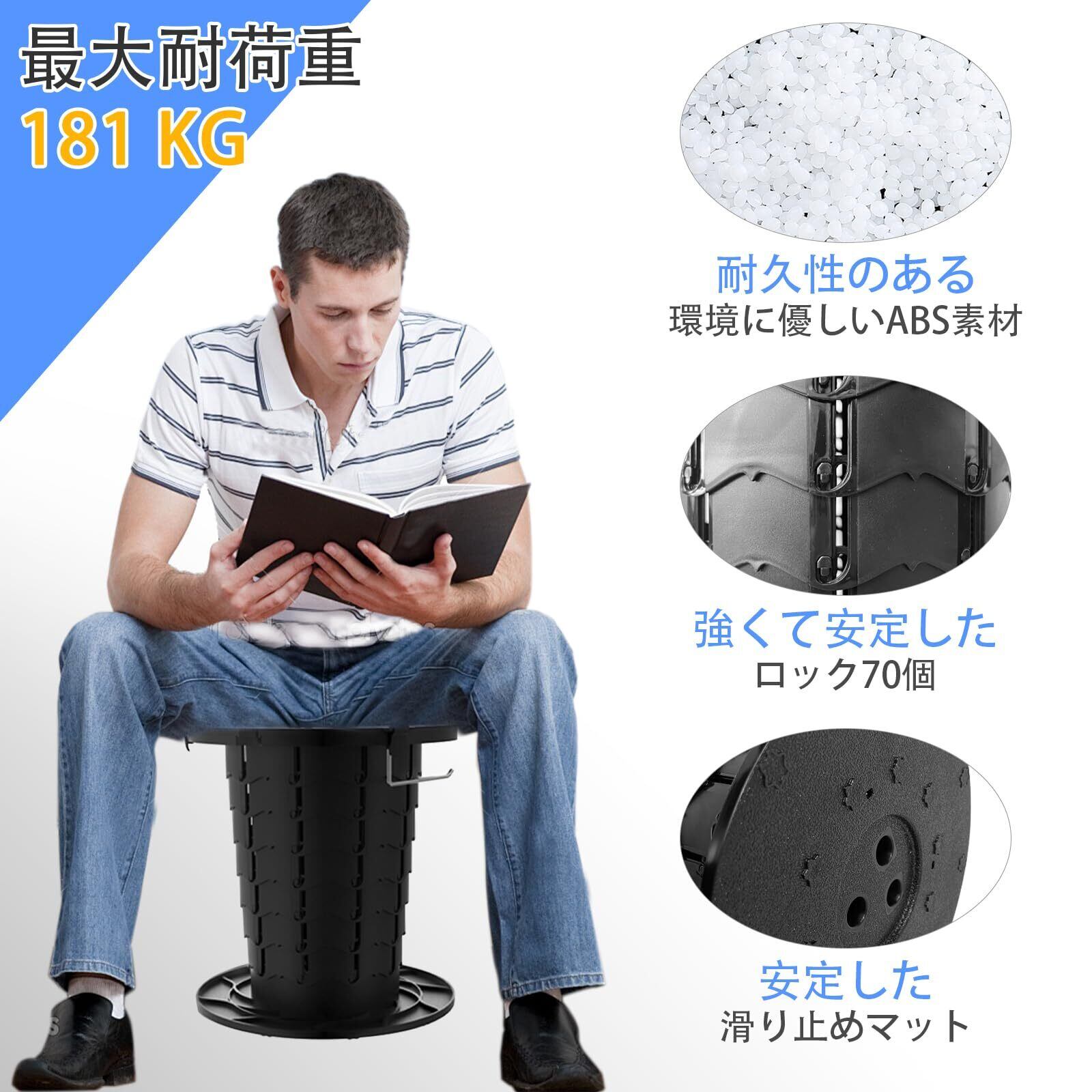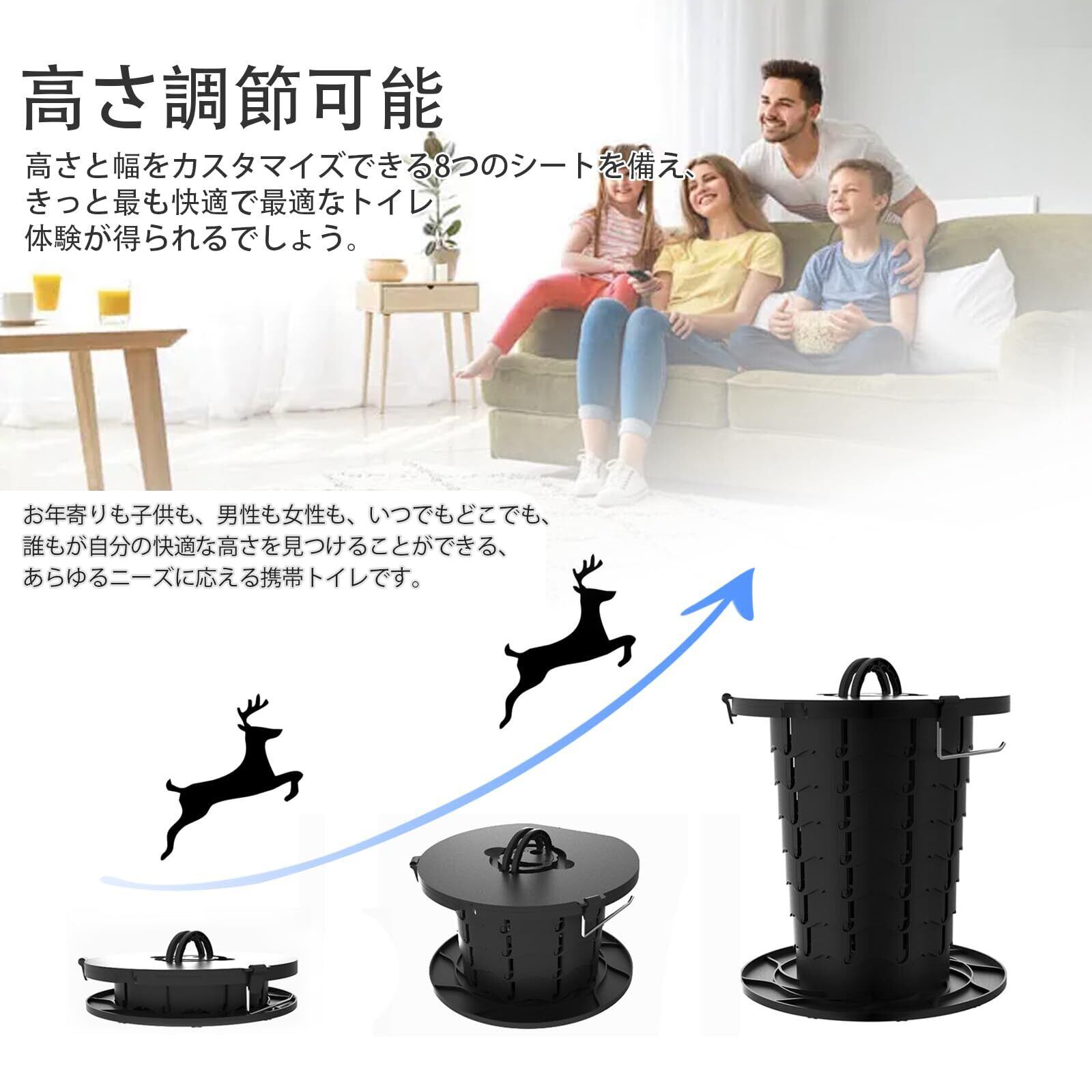 高さ調節可能:収納式デザインで、7.5cmから34.5cmまで簡単に高さを調節できるこのポータブルトイレは、子供、大人、お年寄りなど、すべての人のニーズに対応します。 このキャンプ用トイレを使えば、いつでも快適な高さが見つかります。
