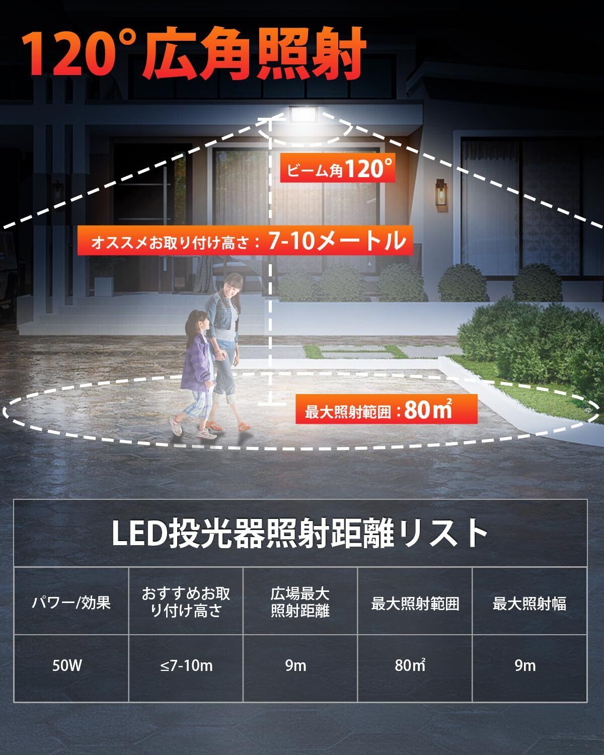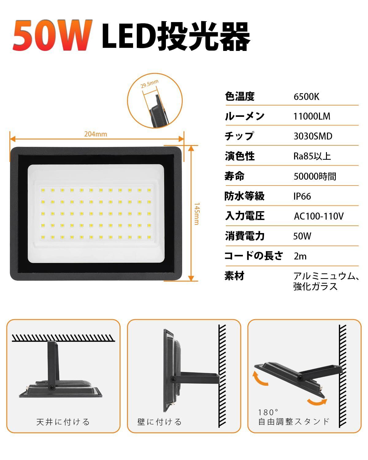 【50W超高輝度型LED投光器&省エネ】本投光器は、基板に広面積・高密度に高光効なSMDチップを実装することで、驚くほどの明るさを実現しました!50Wで全光束11000LMまでできます。白熱電球1100w相当の明るさに匹敵!70%以上の電気代を節約出来ます。更に、当社のLED投光器はAC100V~110Vまで対応可能です。電源を内蔵しているため、AC110V~100Vの電圧で使用する場合も消費電力は変わらないです。安定した明るさを提供し、省エネで長寿命を実現! 「高輝度」「120°広角照明」「低消費電力」「長寿命」などの特性を持ちながら、値段もそんなに高くはありません!