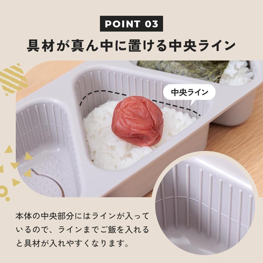 【大きめのおにぎり型】コンビニと同じくらいの、一辺約8cmの三角おにぎりが作れます。1個でも満足感!大きめの型なので、中に具材も入れやすい。本体の中央部分のラインを目安にごはんを入れると、具材がきれいにおさまります。