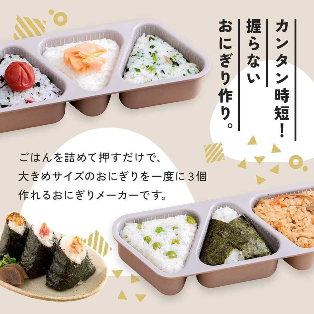 【カンタンおにぎりメーカー】カンタン時短!握らないおにぎり作り。ごはんを詰めて押すだけで、誰でも簡単に同じ形のおにぎりが一度に3個作れます!素手で触れないので衛生的で、炊きたての熱いごはんでも作れます。海苔をセットしたり、混ぜご飯にしたり、具材を入れたり。忙しい朝のお弁当作りや、楽しい行楽・パーティーに。