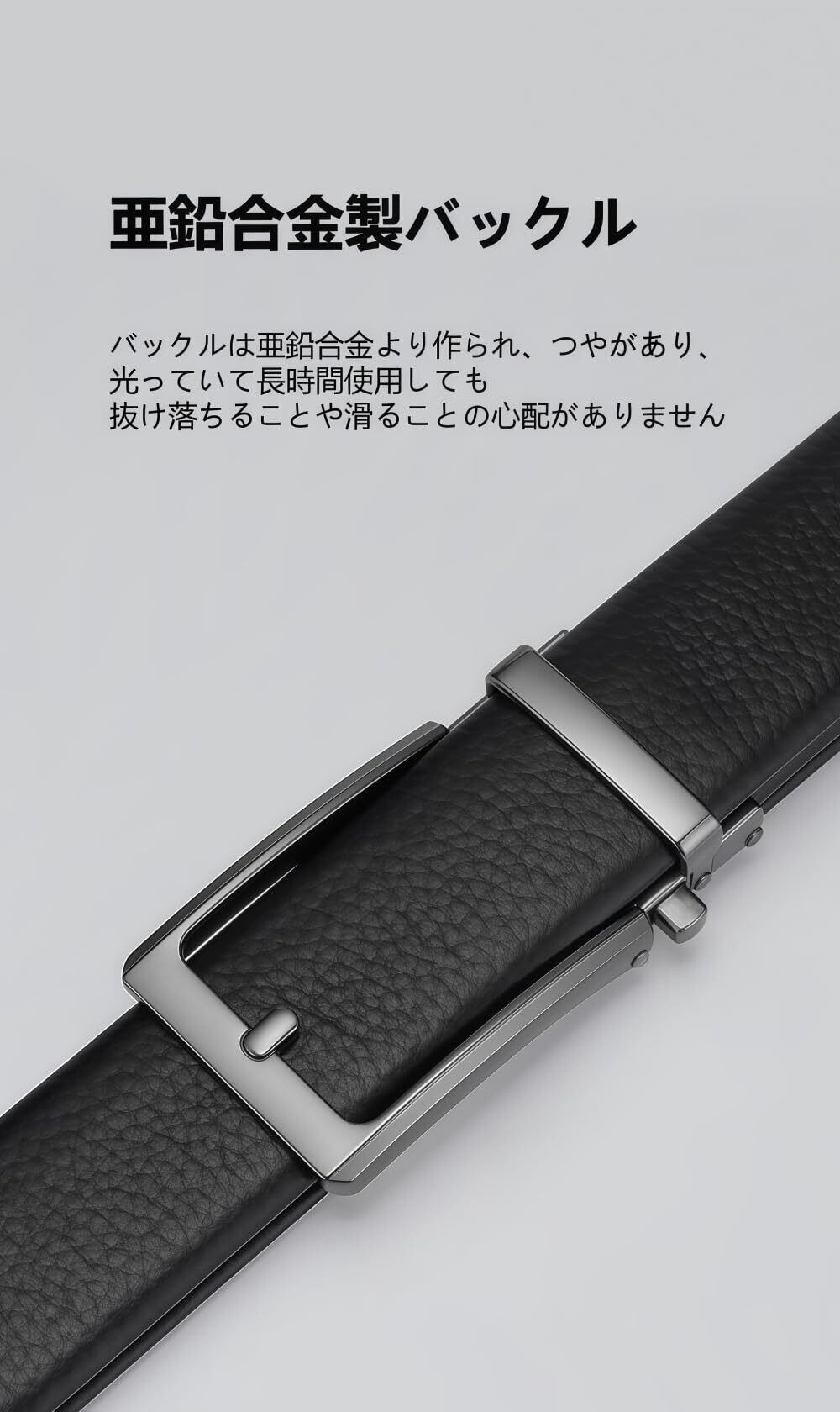 【新型の自動バックル】いつでも微調整ができるオートロックベルト。バックル部分についてるボタンを押すと、ベルトを引っ張るだけでサイズ調整が可能なクリックベルト。クリックベルトなので、ご使用の便利さは卓抜です。無段階調整で穴なしなので緊急の場合では失礼なく紳士的なイメージを保つことができる紳士ベルト。