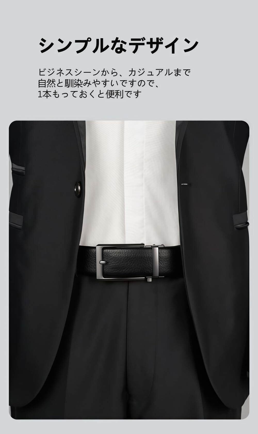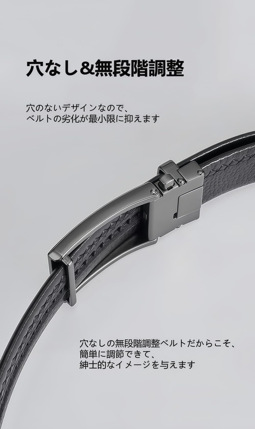 【穴なし&無段階調整】穴のないデザインなので、ベルトの劣化が最小限に抑えます。穴なしの無段階調整ベルトだからこそ、簡単に調節できて、紳士的なイメージを与えます。オートロック式なので、ワンタッチで簡単にサイズ調整が可能です。長時間のドライブや旅行、会食なども窮屈感なくご着用できます。