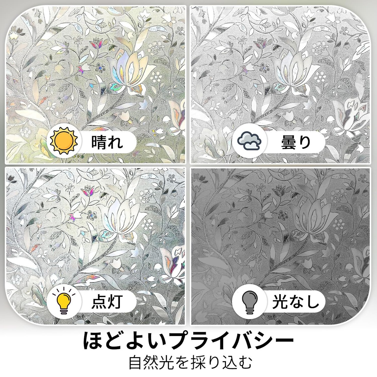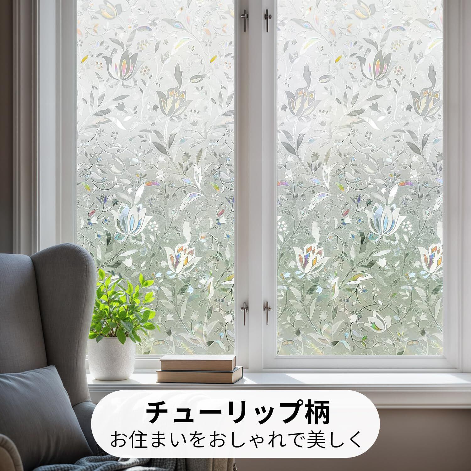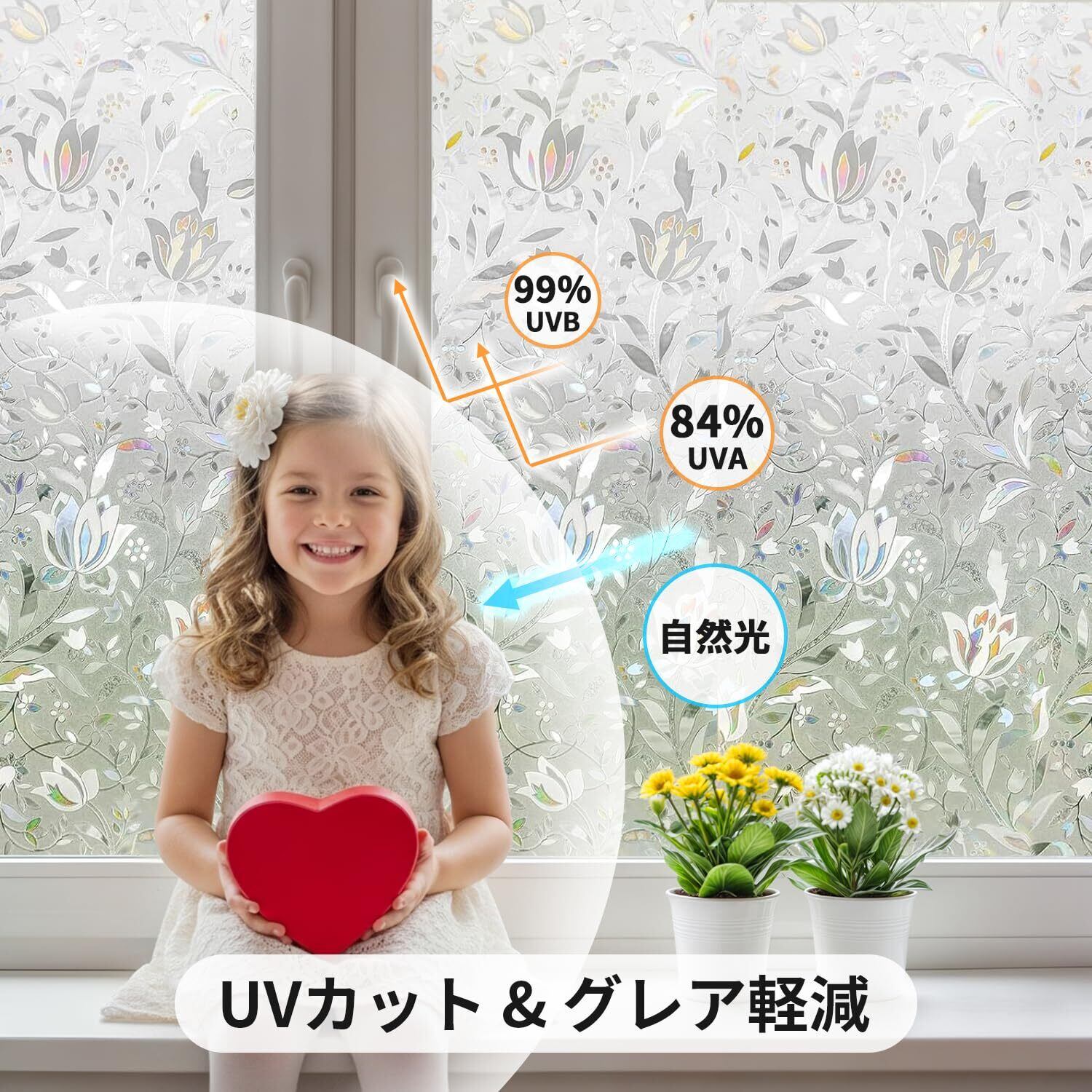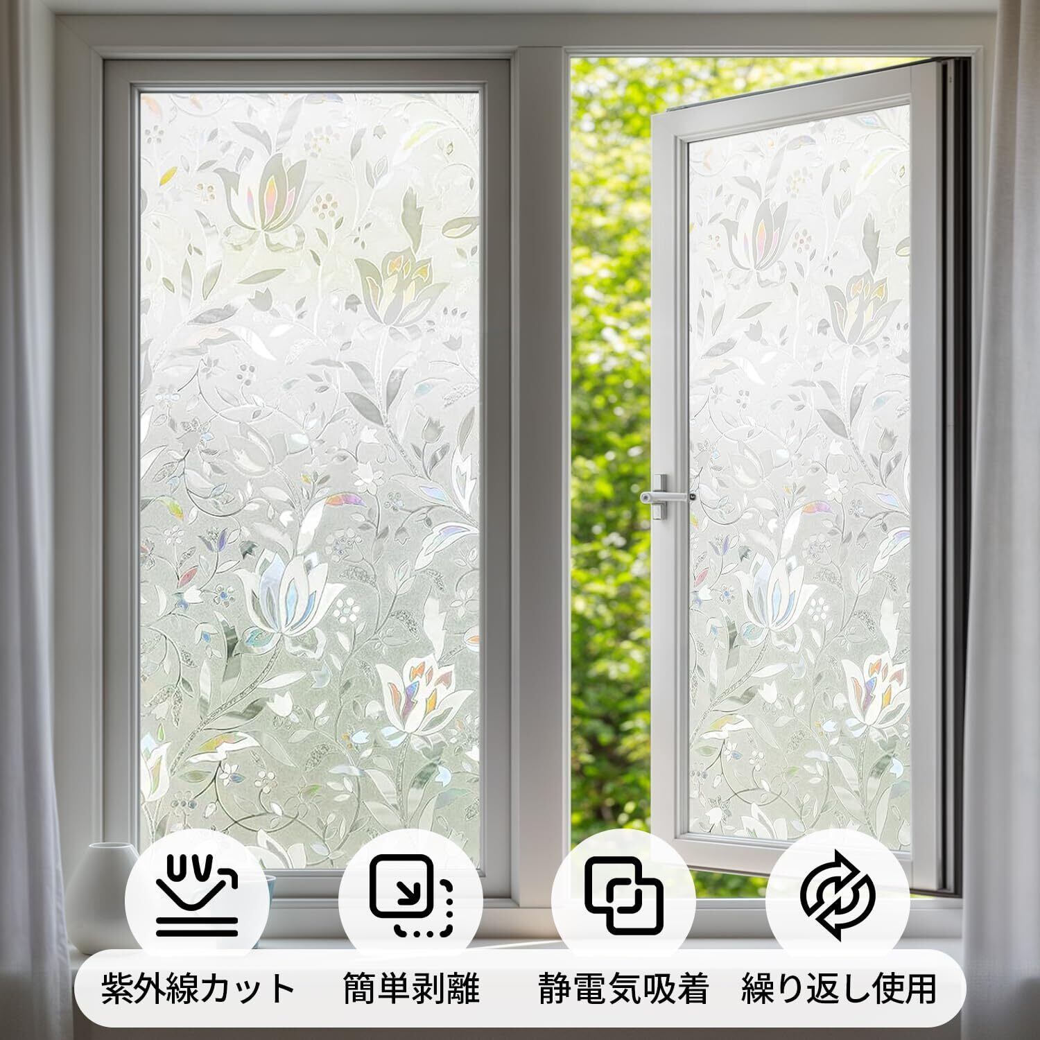 【低コストでステンドグラス風に!プライバシー保護も】無色透明の基材に施された立体感ある3D花柄が特徴です。光が当たると虹色に輝き、室内に優雅な陰影を生み出します。光の角度で表情が変わり、適度な明るさを保ちながら、手軽にプライバシーを守るステンドグラス風シールです。※透け感があるため、浴室などの完全な遮蔽が必要な場所にはおすすめしません。