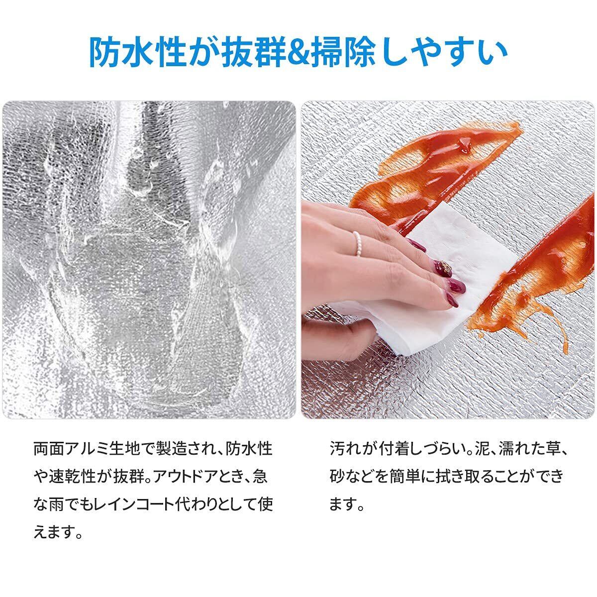 【3層の構造で湿気遮断、断熱と保温】中間層は発泡ポリエチレンで作られるので一層柔らかくなり、快適にご利用いただけます。両面にはアルミ蒸着が施されているため使用中は内側の熱が外部に放散せず、外部の湿気や冷気も遮られます。保温性、断熱性が抜群です。キャンピング時は、テント内で寝袋下にインナーシーツとしても、テントシートとしても使うことができ、体温が保たれるので快適に利用できよう。