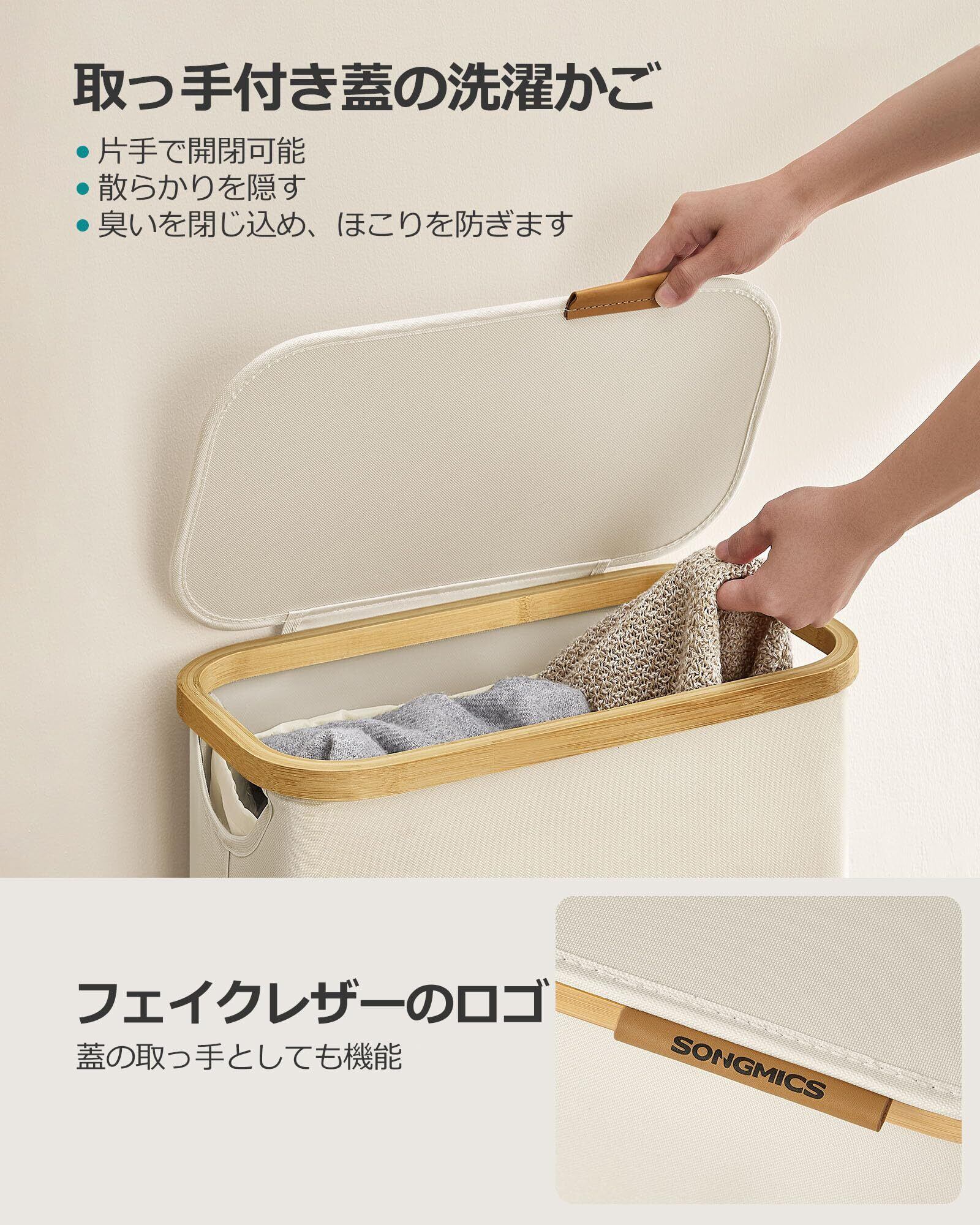 SONGMICS ランドリーバスケット 洗濯かご スリム 折りたたみ式ランドリーバック 65L 大容量 脱衣かご 持ち運び可能 お風呂かご 洗濯物入れ おしゃれ ランドリー収納 ベージュ LCB506W01