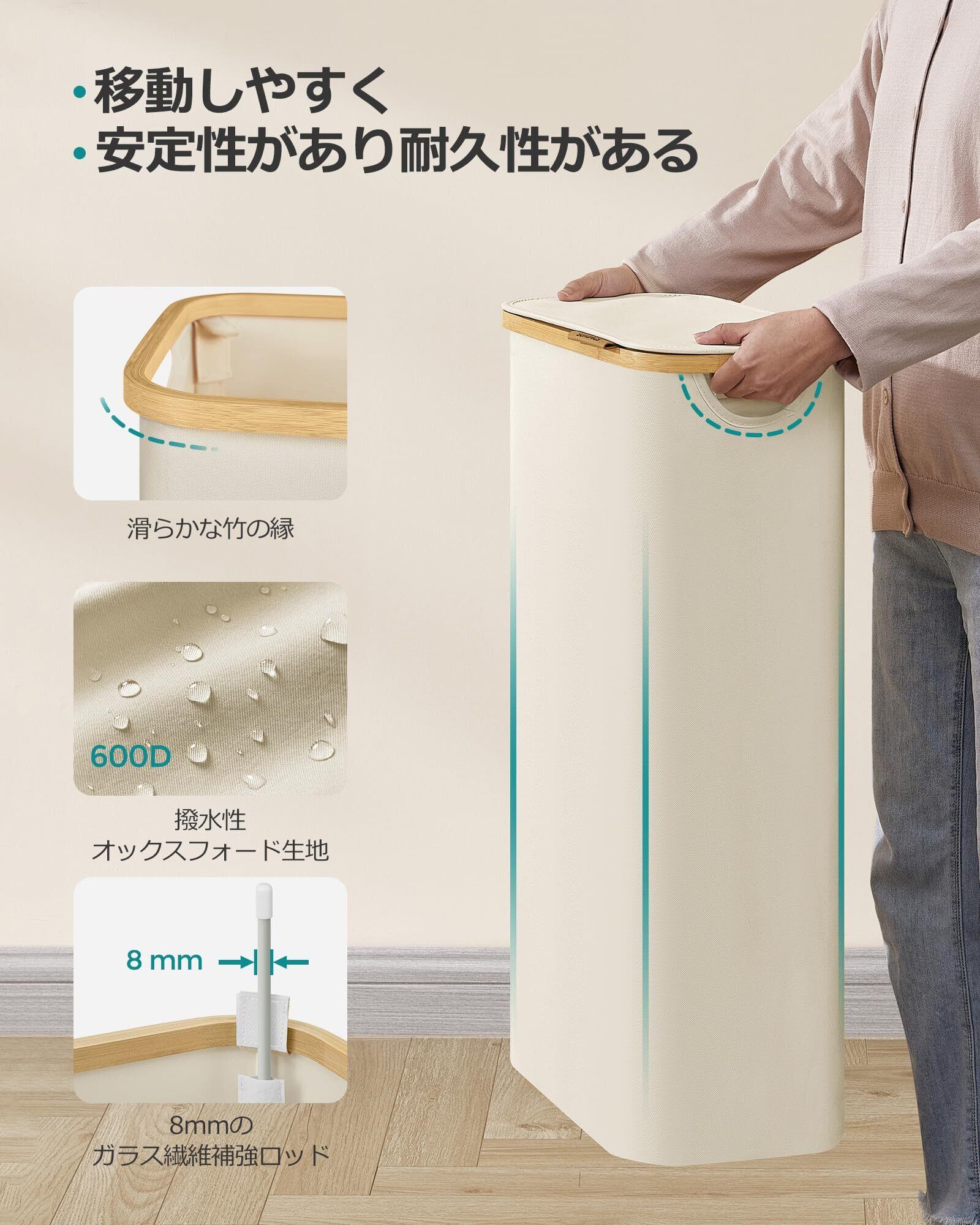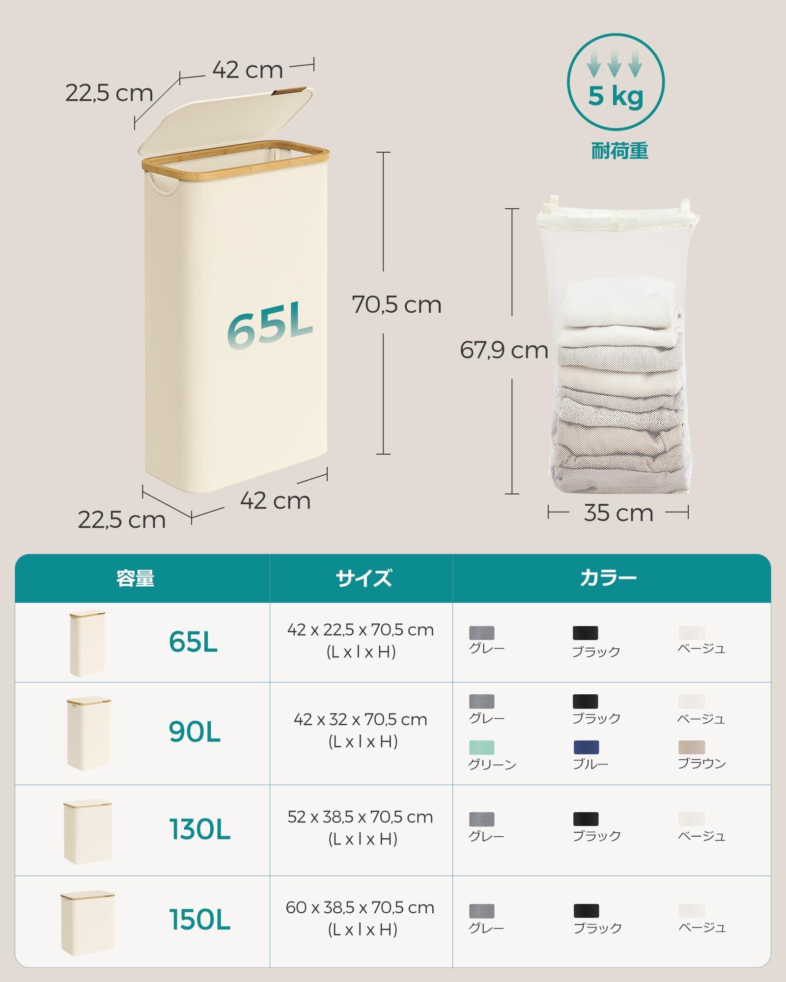 【省スペース大容量】65Lの大容量を誇りながら、22.5cm Dx42cm Wx70.5cmというコンパクトなサイズです。このスリムなランドリー バスケットは狭窄空間にも最適で、限られた生活空間を最大限に活用できます