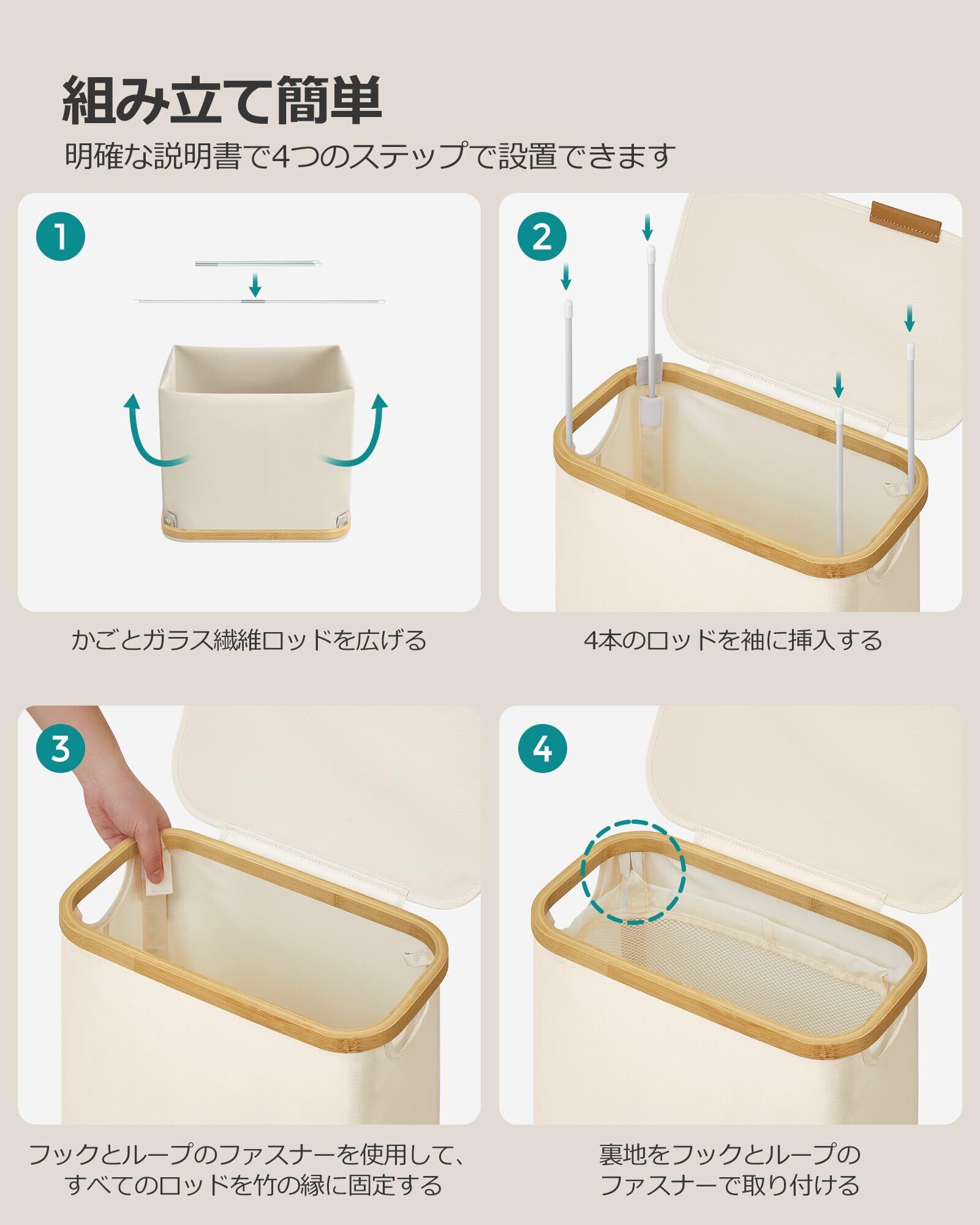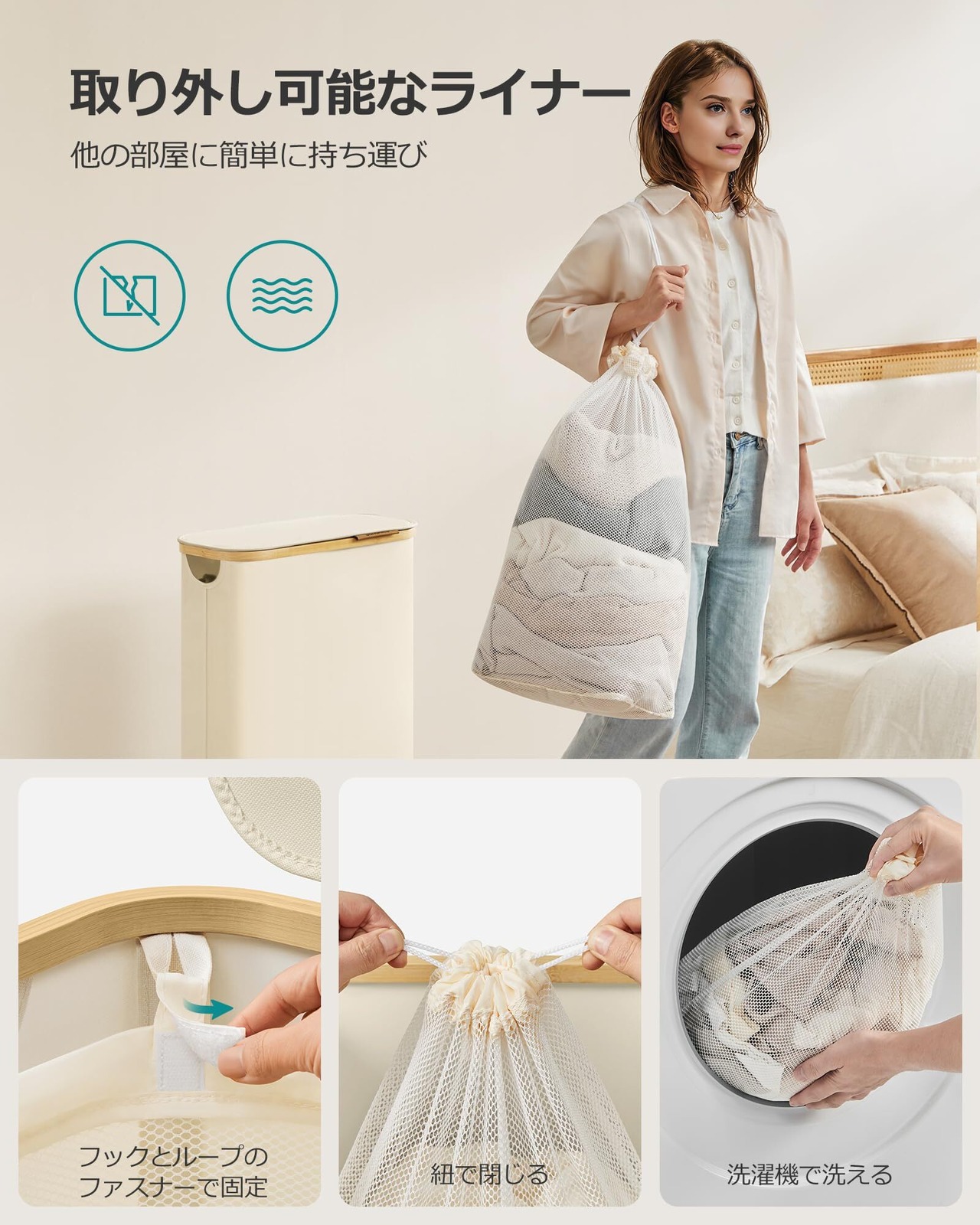 【多機能の着脱式内張り】フック&ループで固定された着脱式内張りは、引き紐付きでお風呂や洗濯室への持ち運びが非常に便利です。洗濯袋としても活用でき、洗濯物の分類作業を簡単に行えます