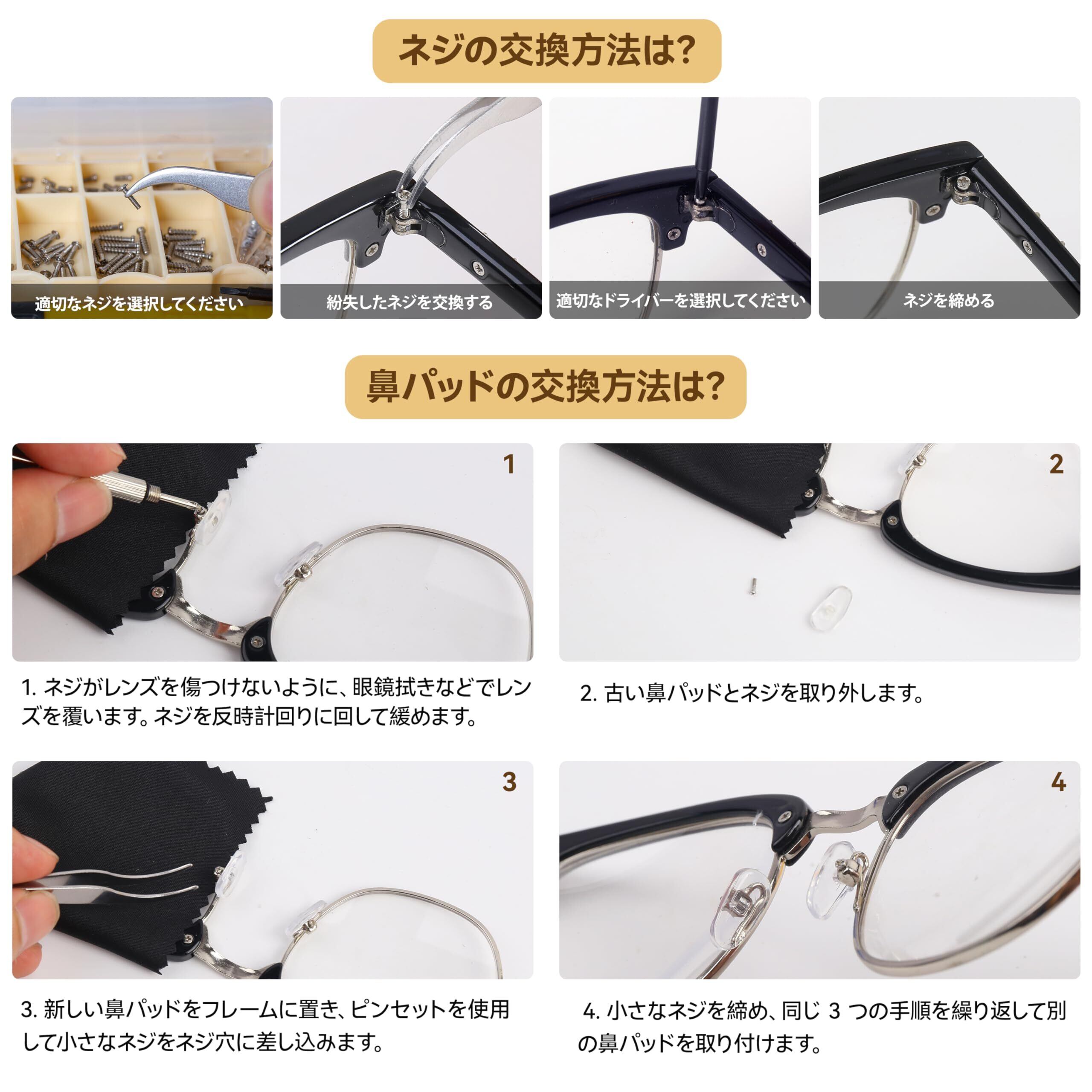 【コンパクト収納のプロ用修理キット】磁気付きプラス/マイナスドライバー各3本、極小ネジ14サイズ、シリコン鼻パッド10組(5サイズ)、精密ピンセット・マイクロドライバー・ワッシャー等、必要な工具/パーツをミニケースに完全収納。自宅で眼鏡店レベルの修理が可能に。