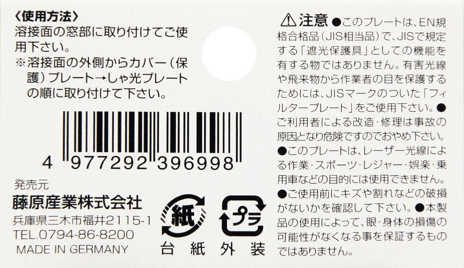 用途:溶接面(電気溶接)用遮光プレート